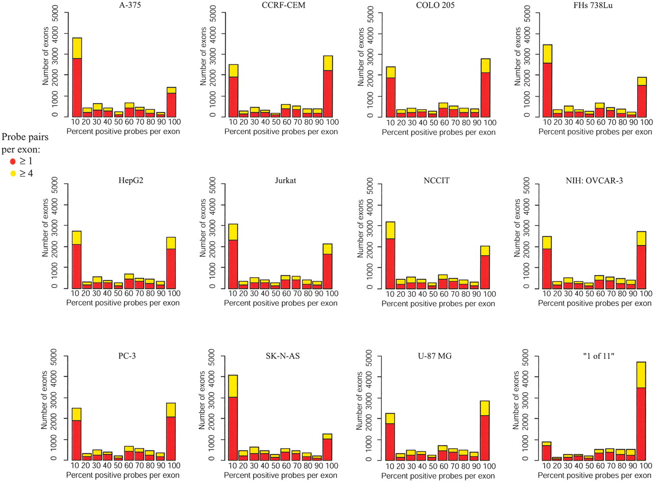 Distribution of positive probes in exons. The distribution of the percent of positive probes in exons is plotted by cell line as well as for the “1 of 11” map. The red bars represent all interrogated exons, and the yellow bars represent exons that contain four more interrogating probe pairs.