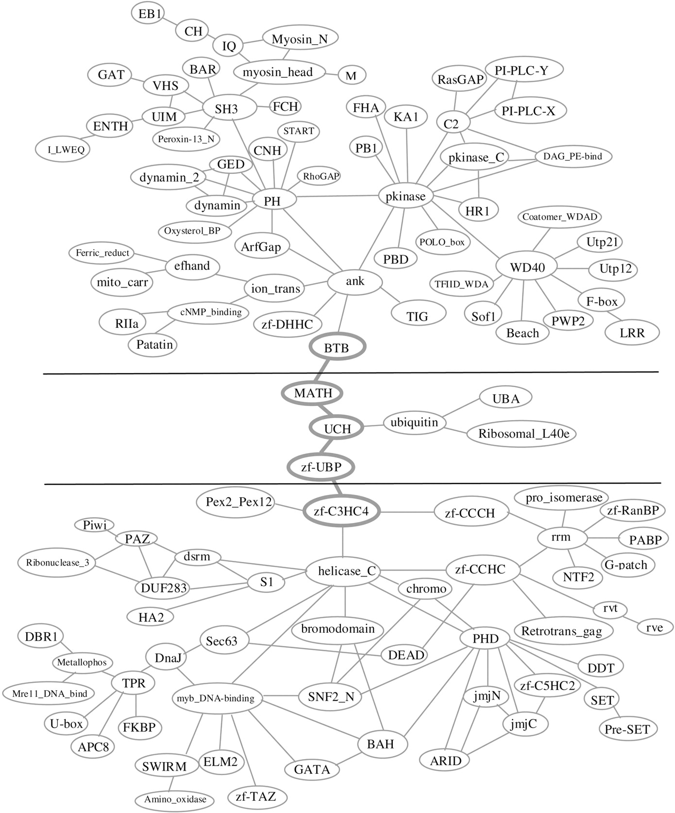 The largest eukaryotic “signature” domain organization. The graph was drawn manually for clarity based on a graphviz layout. See text for details.