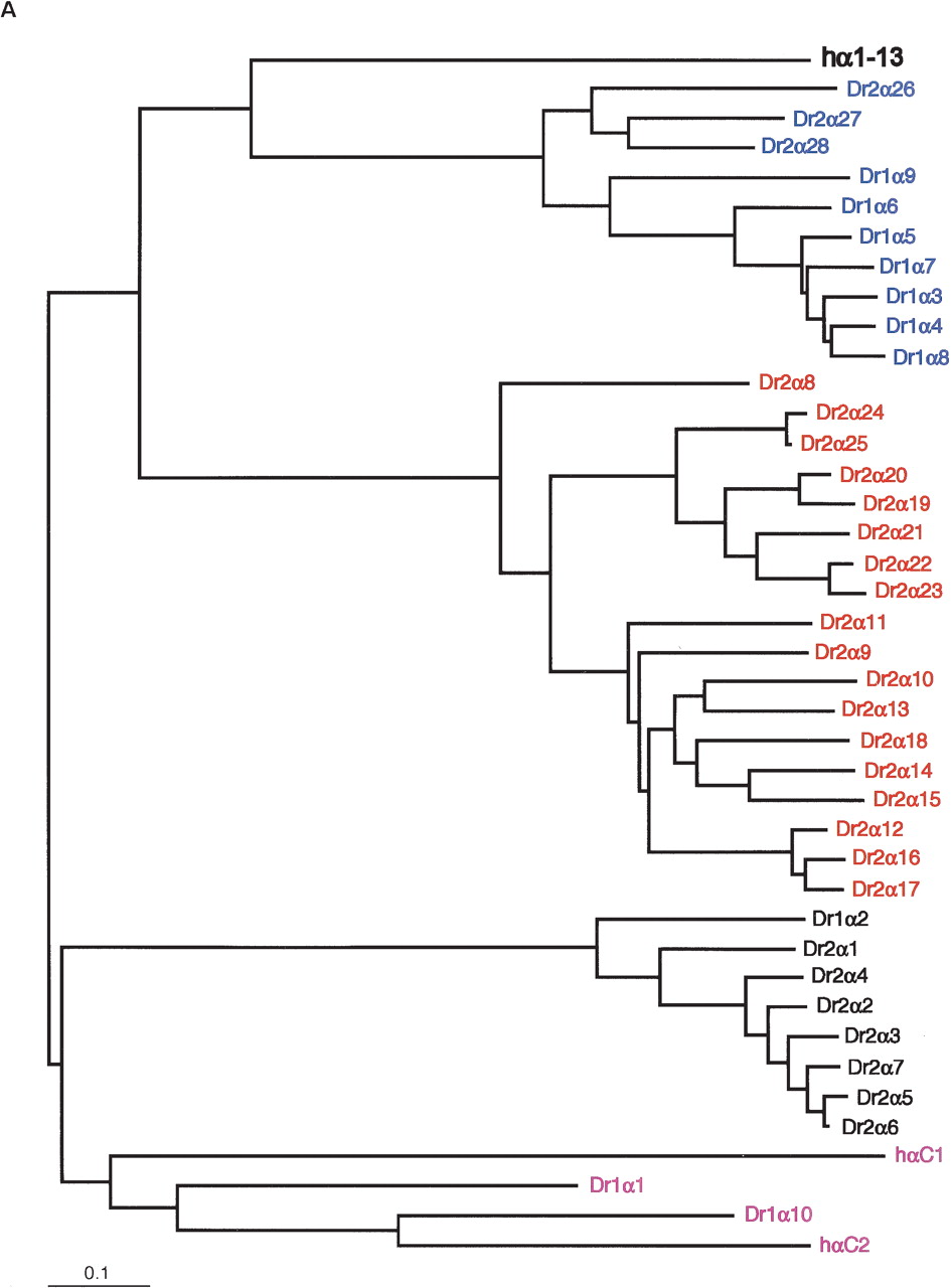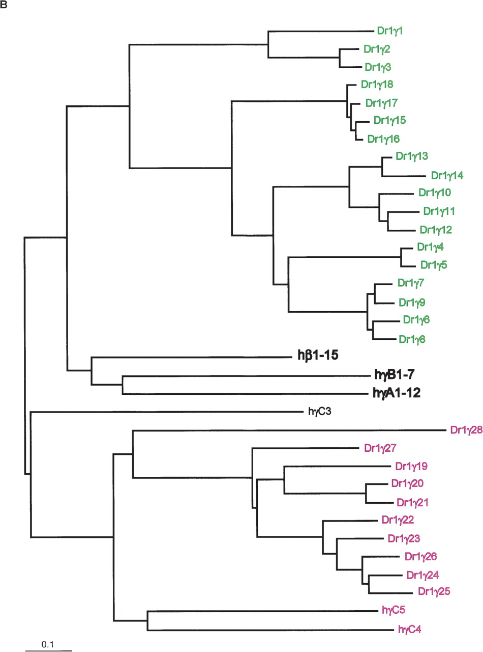 Maximum-likelihood phylogenies of zebrafish and human protocadherin cluster proteins. Members of paralog subgroups are indicated by color as in Figure 1. For clarity, subtrees of human protocadherin subgroups are shown as single branches in each tree, except for human C-type protocadherins, which are shown individually in purple. Trees are rooted by midpoint. (A) Protein tree of DrPcdh1α, DrPcdh2α, and human Pcdhα. (B) Protein tree of DrPcdh1γ, human Pcdhβ, and Pcdhγ.