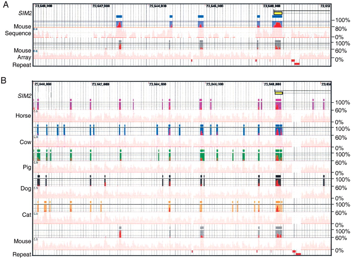 Conserved human sequences in the 10-kb interval surrounding the first exon of SIM2 (yellow rectangle). The conserved elements are shown relative to their position in the human reference sequence (horizontal axis), and their percent conformances (vertical axis). (Position numbers) The position on human 21q (NCBI contig NT_002836). (A) Rectangles rising above the veil indicate conserved human–mouse elements identified by two methods; (blue) sequence alignment (≥100 bp and 80% identify); (gray) 21q array data (≥30 bp and 60% conformance). Red rectangles at the bottom indicate the positions of interspersed repeats, which were not tiled on the arrays, and therefore, conformance information is absent. (B) Rectangles indicate conserved human elements (≥30-nt length and ≥60% conformance) identified by comparisons of horse, cow, pig, dog, cat, and mouse DNA by hybridization to human 21q arrays.