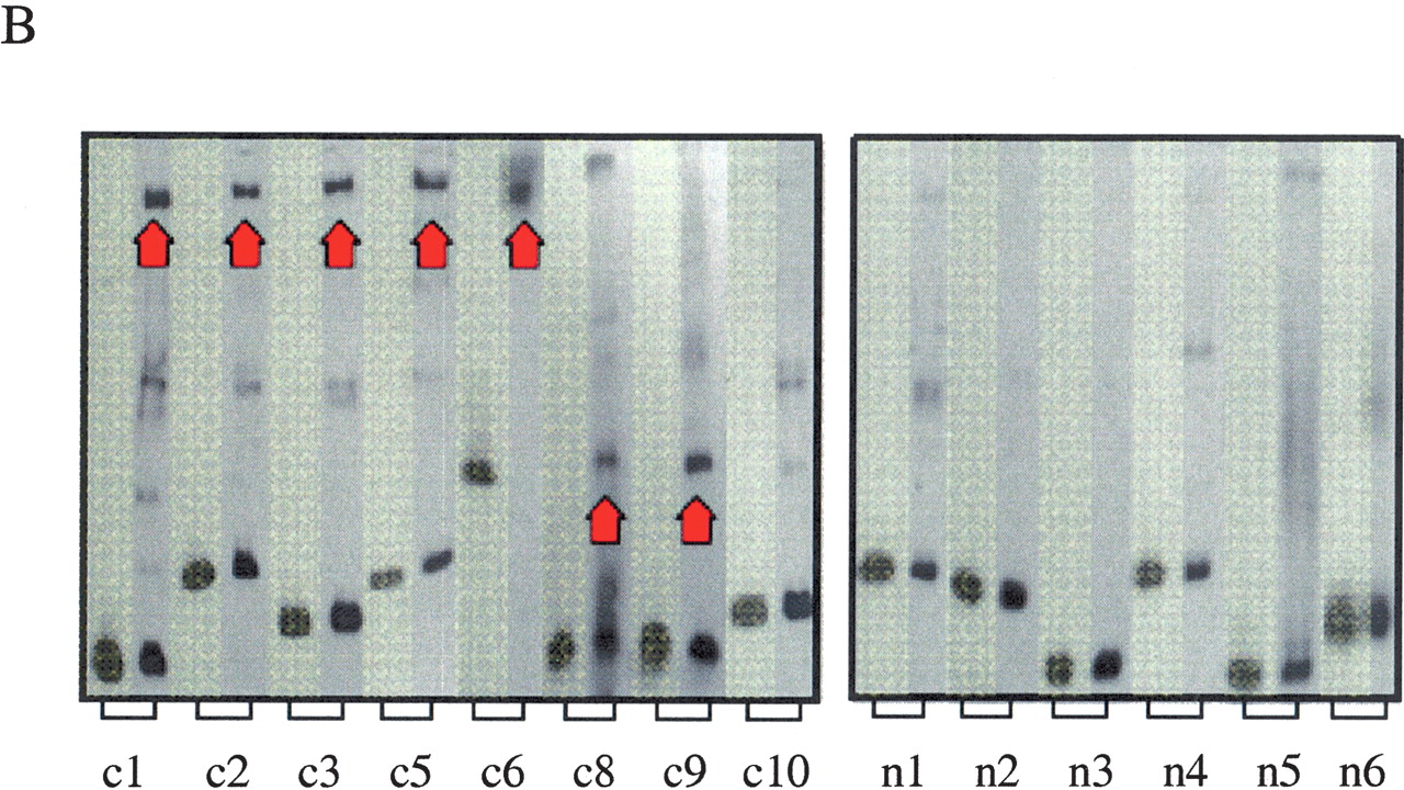 Functional characterization of noncoding sequences. (A) Expression values of 16 independent luciferase reporter constructs as assayed by transfection analysis; (filled bars) conserved noncoding sequences; (open bars) nonconserved noncoding sequences inserted in front of the SIM2 promoter (see Fig. 3A). Luciferase expression values, normalized against β-galactosidase expression values, are averages of 12 individual experiments (each construct was analyzed in triplicate on four different days) and are expressed as the percent increase in activity over the control (the luciferase reporter construct containing only the SIM2 promoter). The means across conserved and nonconserved sequences (dotted lines) were significantly different (P ∼ 0.0047, two sample t-test). Error bars, one SD. (B) Electrophoretic mobility-shift patterns of noncoding DNA fragments. (Lane 1, highlighted) DNA fragment alone; (lane 2) DNA fragment incubated with nuclear extract. (Red arrows) Band-shift indicating DNA–protein binding. Conserved elements c4 and c7 were too long for gel-shift analysis.