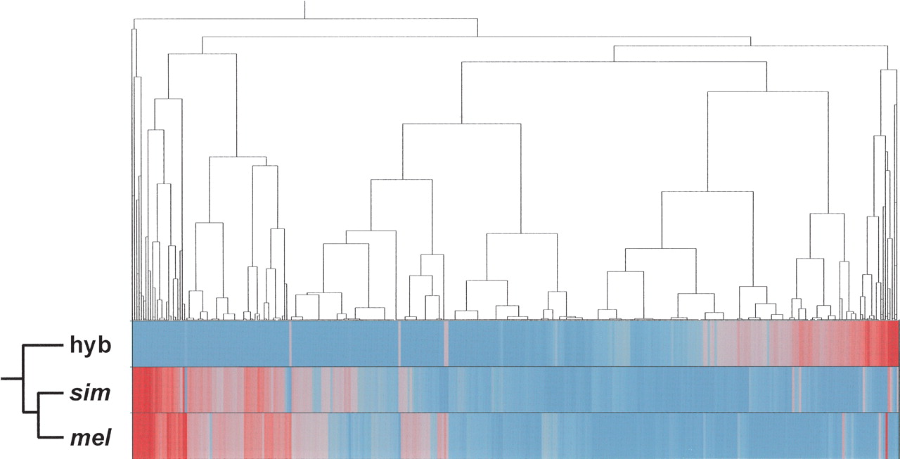 Hierarchical clustering of the mean levels of expressions estimated using a Bayesian methodology (BAGEL) for the whole-body experiments. Underexpressed genes (blue); overexpressed genes (red). Ward's minimum variance was used as a distance metric. The dendrogram includes 3965 genes that showed significantly different expression levels in at least one of the three pairwise comparisons between females. (mel) D. melanogaster; (sim) D. simulans; (hyb) hybrid.