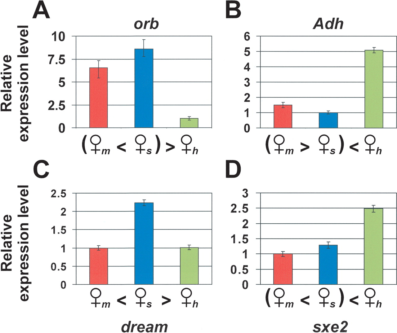 Patterns of misregulation between hybrids and females of D. melanogaster and D. simulans in whole-body experiments. (A) orb, a gene underexpressed in the hybrid and required for correct oogenesis in a normal female. (B) Adh, a gene overexpressed in the hybrid that is highly expressed in the fat body (Dickinson et al. 1984). (C) dream, a gene for which the allele of D. melanogaster is dominant over that of D. simulans, which involves a higher level of expression. (D) sxe2, a gene overexpressed in the hybrid that is expressed in the brain of males only (Fujii and Amrein 2002). Female symbol subscripts indicate the genotype; (m) D. melanogaster; (s) D. simulans; (h) hybrid. Error bars indicate the 95% credible intervals around the estimated mean expression level. Three pairwise comparisons are possible among the three female genotypes. Differences in level of gene expression are regarded to be statistically significant if the 95% credible intervals of the estimates failed to overlap. (=) No significant difference; (>) significant overexpression.