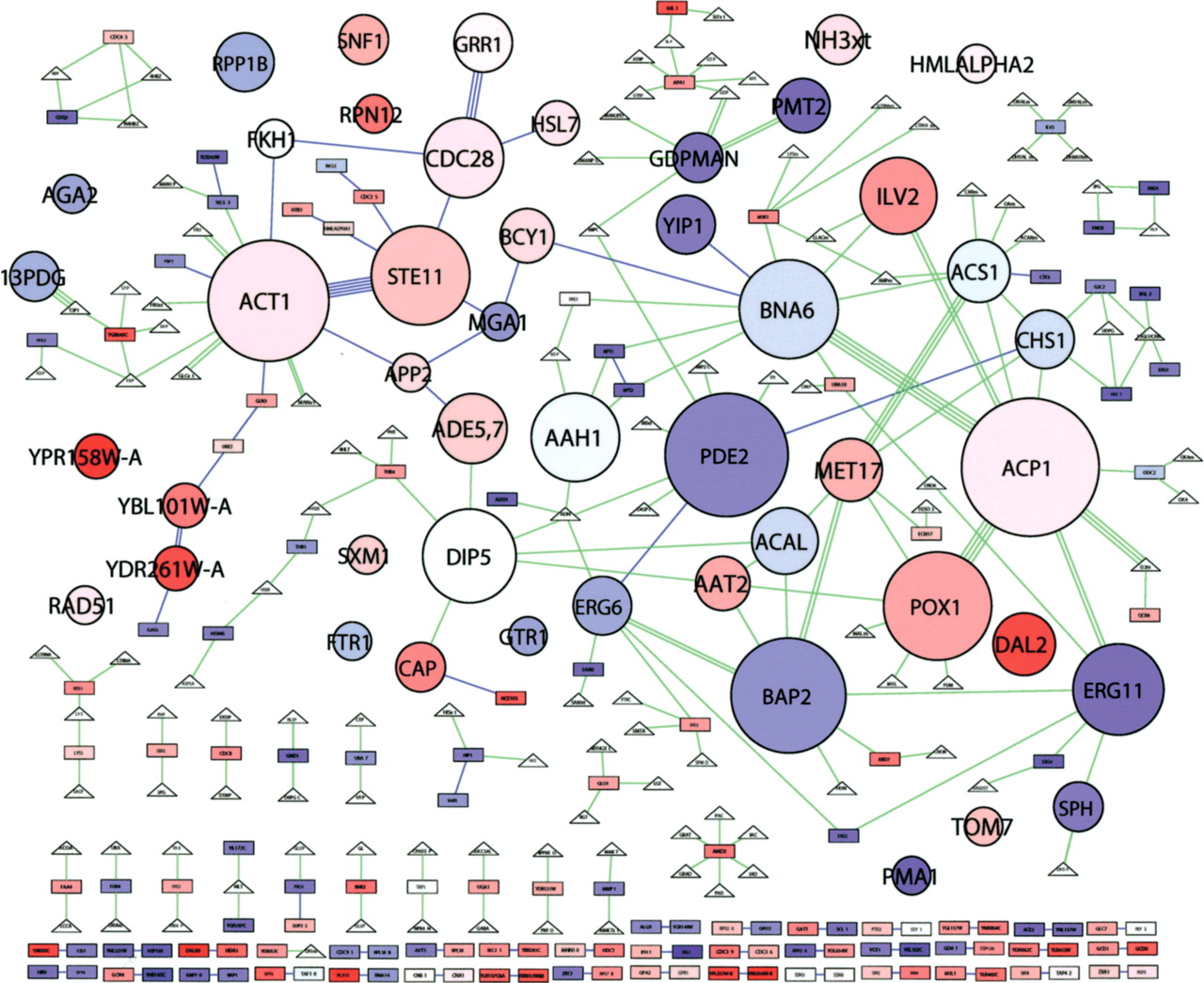 Modular abstraction of the filamentation network. Network clusters are abstracted as circular “module nodes.” Otherwise, colors and shapes represent the same as in Figure 2. The area of each module node is proportional to the number of member molecules. The color of each module node reflects the average expression log-ratio of member genes. Each module node is automatically assigned the name of the member node of highest intracluster degree (the highest number of interactions with cluster co-members); most are proteins, some are metabolites. See Supplemental Table 3 for a list of cluster members.