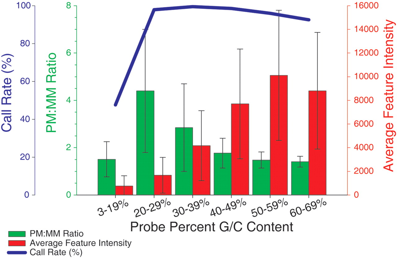 Stratification of probes according to %G/C and assessment of probe performance. All PM probes were binned according to %G/C, and average PM/MM ratios, call rates, and average feature intensities were calculated. G/C content <20% or >50% leads to lowest PM/MM ratios, resulting in increased rate of ambiguous calls.
