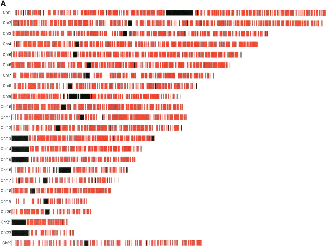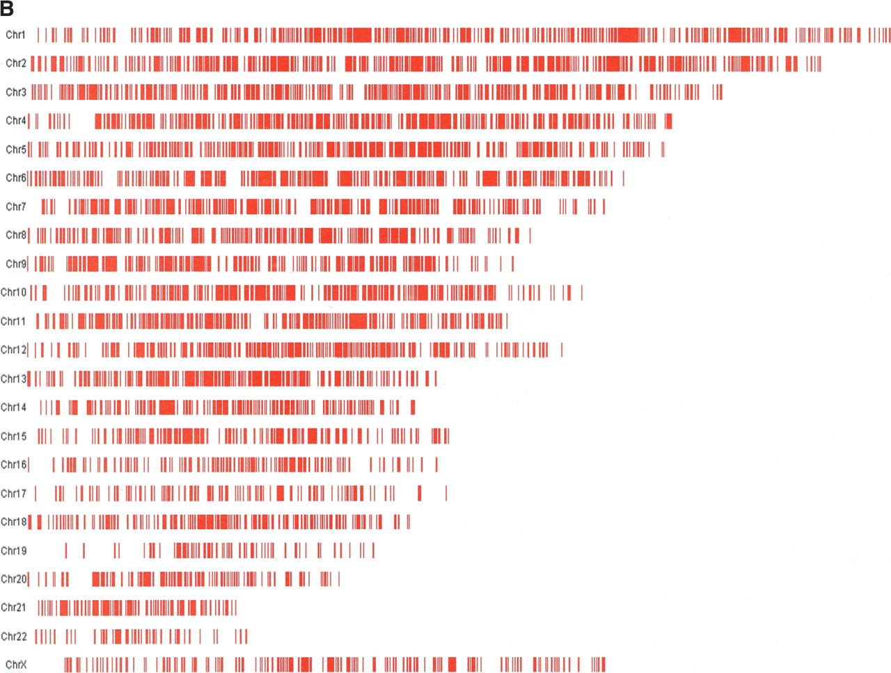 (A) Distribution of SNPs across the genome. Physical map assignments of 11,384 SNPs are based on the November 2002 release of the UCSC Golden Path (http://genome.ucsc.edu/). Red vertical bars represent the presence of at least one SNP in 100-kb regions. Black vertical bars represent large contig gaps that are 100,000 N's or longer. The Y chromosome is not shown because none of the 11,555 SNPs map to this chromosome. (B) SNPs distributed on the basis of genetic distances across the genome. Red bars represent the presence of at least one genotyped SNP in 0.1-cM intervals. Genetic distance assignments were based on interpolations against the deCODE STR genetic map (Kong et al. 2002). STR markers that had discrepant chromosome assignments and ordering between the deCODE map and Golden Path were omitted from the interpolation. Pairs of deCODE STRs with unique physical positions were used as local landmarks to interpolate genetic distances for SNPs located between the STRs. The interpolation makes the simplifying assumption that physical and genetic distances correlate linearly over the short localized regions of the chromosomes defined by pairs of STRs drawn from the 5136 STRs on the deCODE map. Physical map positions as well as the interpolated genetic distances are reported for each SNP in the Supplemental material (SNP Information).