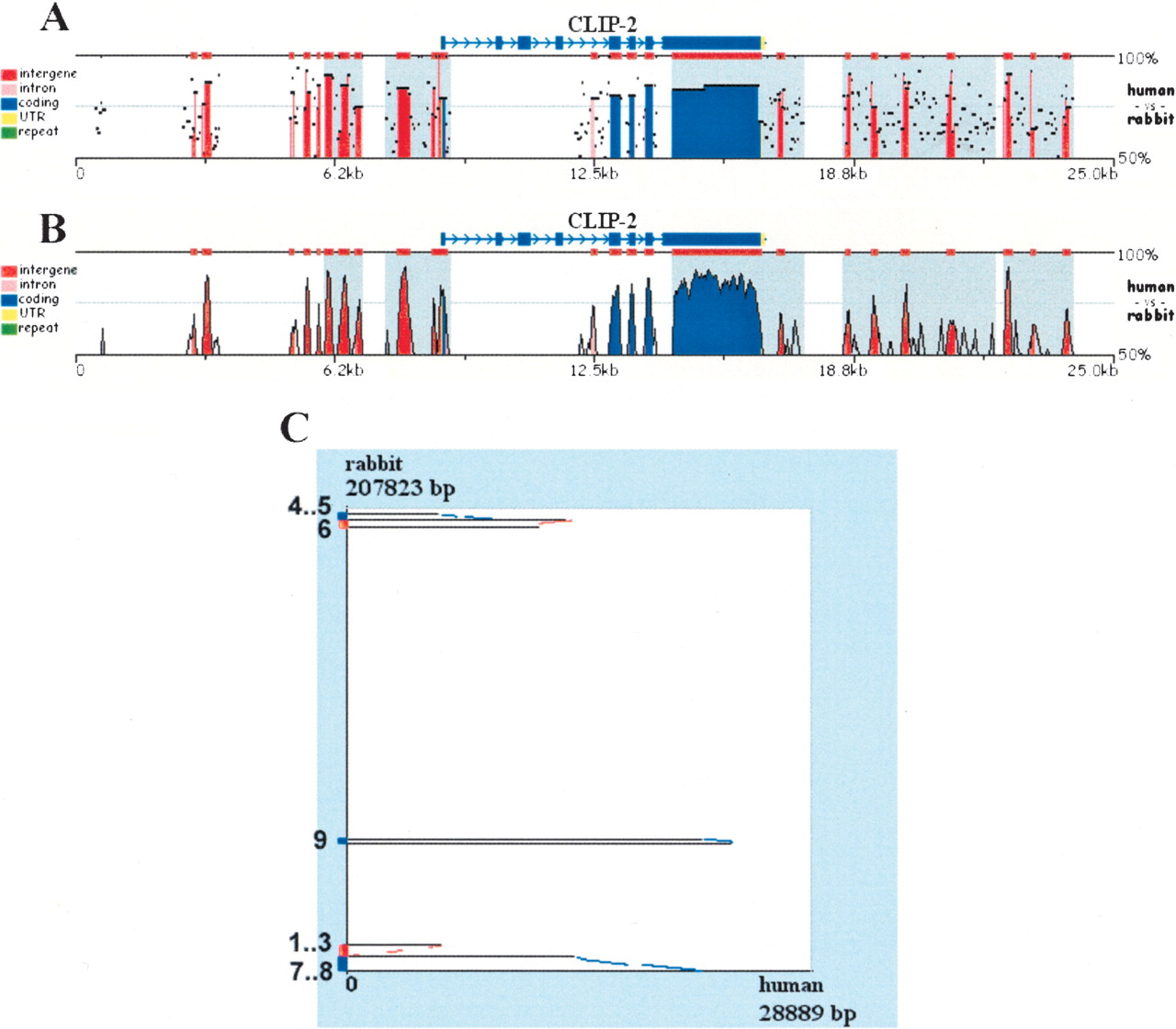 Pip (A), smooth-graph (B), and Dot-plots (C) constructed by zPicture for a 29-kb region from human chromosome 19 (chr19:19501332–19530220) and an orthologous rabbit BAC (NCBI Acc# AC145542.1). The automatic sequence upload feature extracted the human sequences and the RefSeq annotation files from the UCSC database. Default parameters (>100 bp/>70% ID) were used to highlight intronic (pink) and intragenic (red) conserved elements. Untranslated Regions (UTRs) are colored in yellow, exons are in blue and repeats are in green. Inverted regions are shaded in gray. Dot-plots (C) can be used to order and orient draft sequence contigs; positive strand alignments are in red and negative strand in blue.