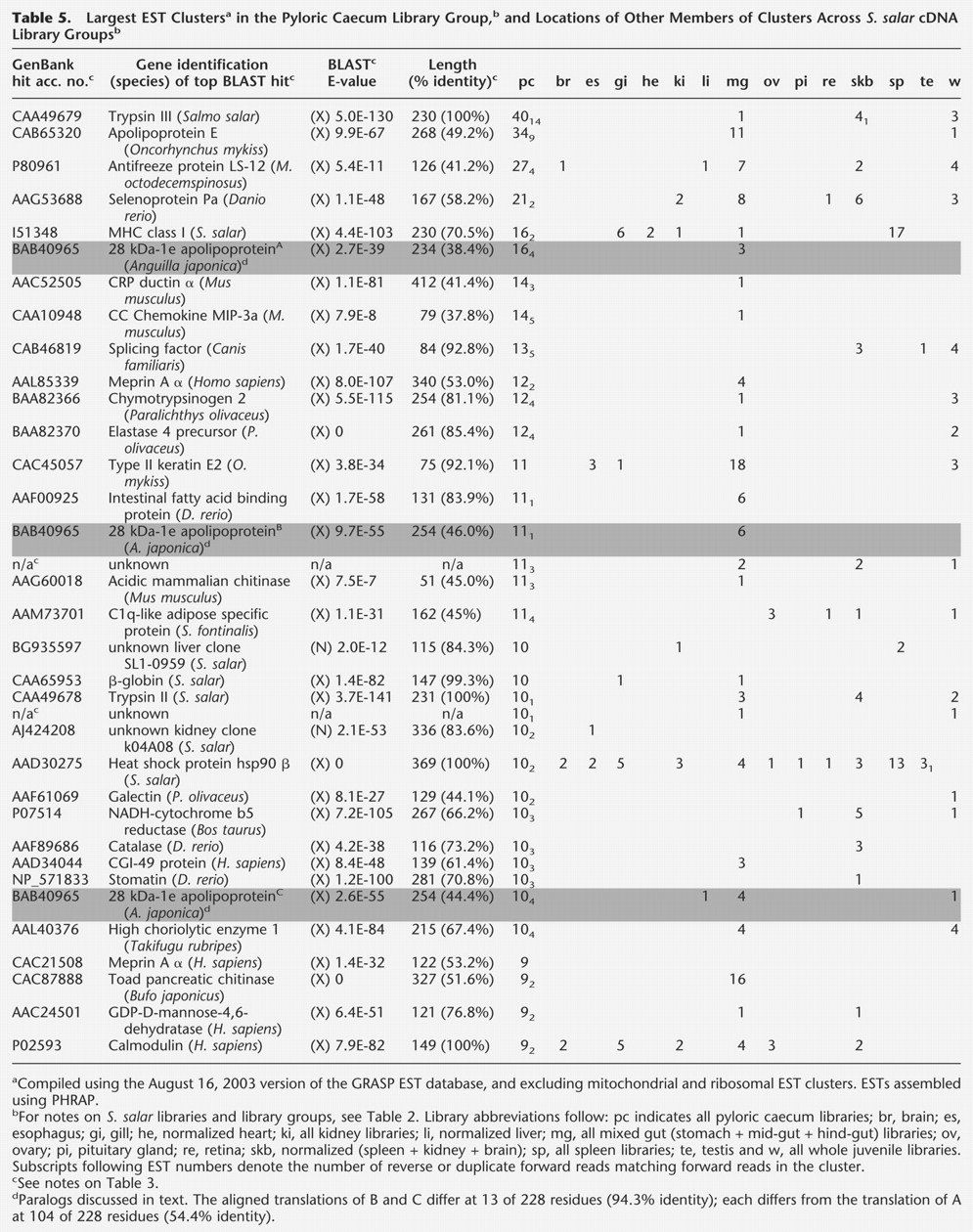 Largest EST Clustersa in the Pyloric Caecum Library Group,b and Locations of Other Members of Clusters Across S. salar cDNA Library Groupsb