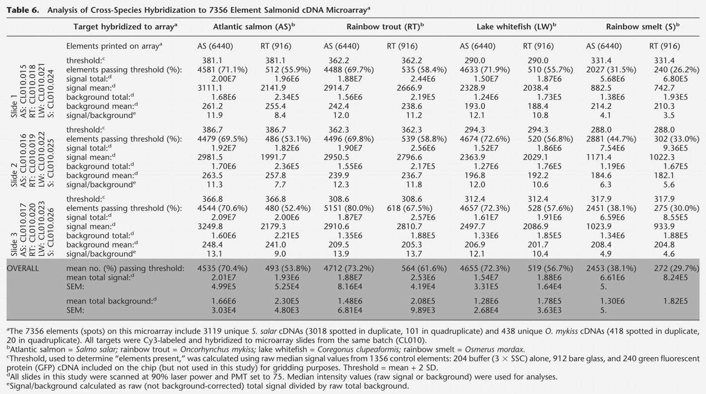 Analysis of Cross-Species Hybridization to 7356 Element Salmonid cDNA Microarraya