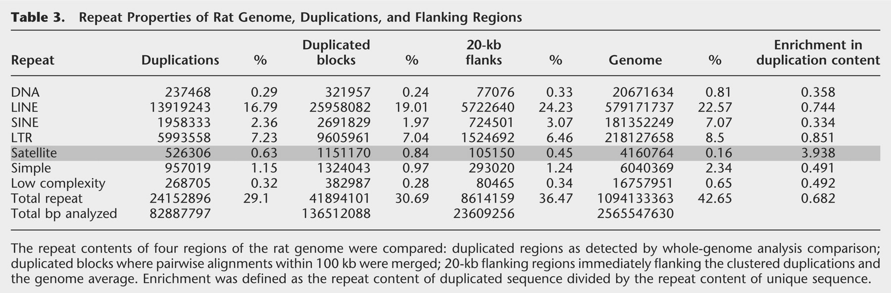 The repeat contents of four regions of the rat genome were compared: duplicated regions as detected by whole-genome analysis comparison; duplicated blocks where pairwise alignments within 100 kb were merged; 20-kb flanking regions immediately flanking the clustered duplications and the genome average. Enrichment was defined as the repeat content of duplicated sequence divided by the repeat content of unique sequence.