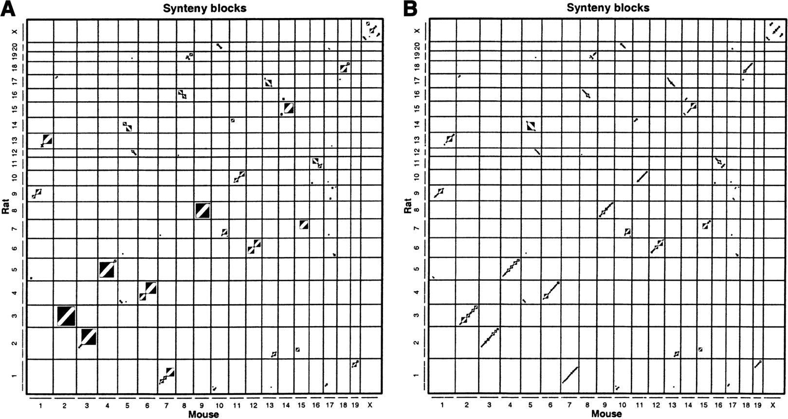 (A) The 162 two-way synteny blocks between mouse and rat, of size at least 300 kb, computed by direct two-way comparison of mouse and rat. Synteny blocks are shown as rectangles with a diagonal stripe to indicate direction. (B) The 391 three-way human–mouse–rat syntenic blocks of size at least 300 kb, shown in their mouse–rat coordinates. Introducing human splits of many of the synteny blocks in A into smaller ones in B, and also removes regions that do not have a human homolog. Higher quality versions of these plots are available in the Supplemental materials.
