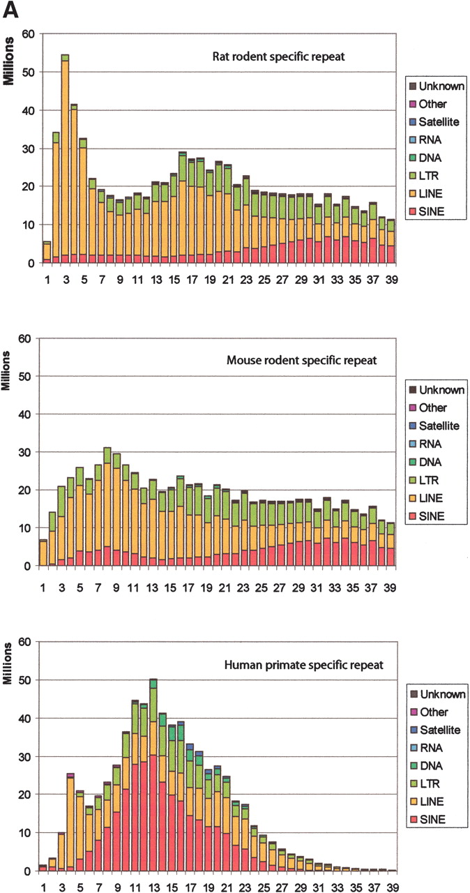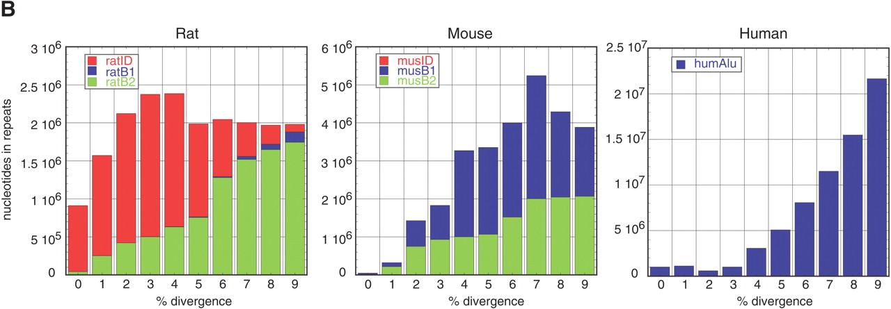 Age distribution of repeats in rat, mouse, and human that have inserted since their divergence from AHMR. The x-axis represents divergence from consensus sequences, corrected for multiple hits at a single site using the Jukes-Cantor model (Jukes and Cantor 1969). This model was chosen for this analysis to be consistent with previous publications (International Human Genome Sequencing Consortium 2001; Mouse Genome Sequencing Consortium 2002). The y-axis is the number of nucleotides occupied by each repeat family at each divergence level. (A) Distribution for all repeat families that have accumulated since the divergence from AHMR. For rat, the repeats are those that accumulated along both the rodent and the rat branches (Fig. 1); for mouse, the repeats are those that accumulated along both the rodent and the mouse branches (Fig. 1); for human, the repeats are those that accumulated along the human branch (Fig. 1). (B) Distribution of recent mammalian SINEs by age and family. The number of nucleotides in each family is plotted by percent divergence from the consensus sequence for each family. Only recent SINEs (0%–9% divergence) are examined in rat (left), mouse (middle), and human (right). The rat recent SINEs consist of IDs (red), B1s (blue), and B2s (green). The recent SINEs in mouse consist of B1s (blue) and B2s (green); the mouse IDs are not visible on the plot. Recent SINEs in humans are exclusively Alu repeats (blue).
