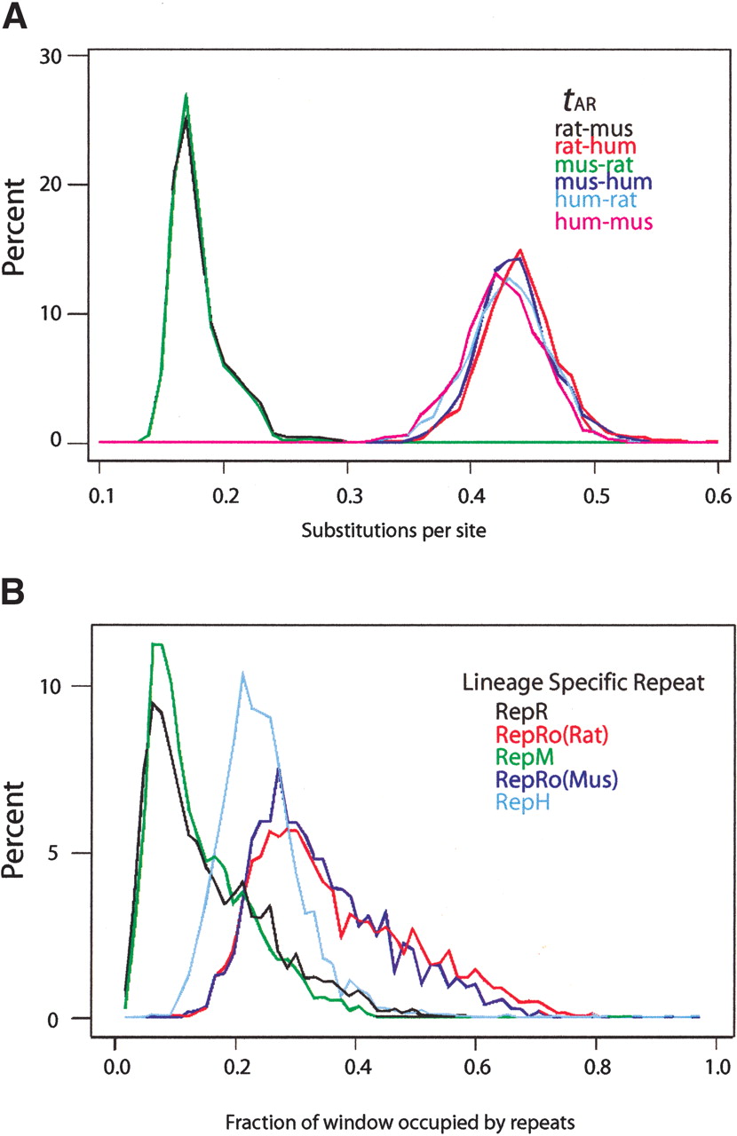 Distributions of divergence rates for pairwise comparisons among rat, mouse, and human. (A) Histograms of tAR, the local nucleotide substitution rate in aligned ancestral repeats, for alignments between rat and mouse (black line), mouse and rat (green line), rat and human (red line), mouse and human alignments (dark blue line), human and rat (light blue line), and human and mouse (violet line). (B) Histograms of the density of lineage-specific interspersed repeats on the rat branch (RepR, black line), the mouse branch (RepM, green line), the human branch (RepH, light blue line), and the rodent branch (RepRo). The latter was computed in the rat genome to determine RepRo(Rat), the red line, and in the mouse genome to determine RepRo(Mus), the dark blue line. All measures were computed in 1-Mb nonoverlapping windows.