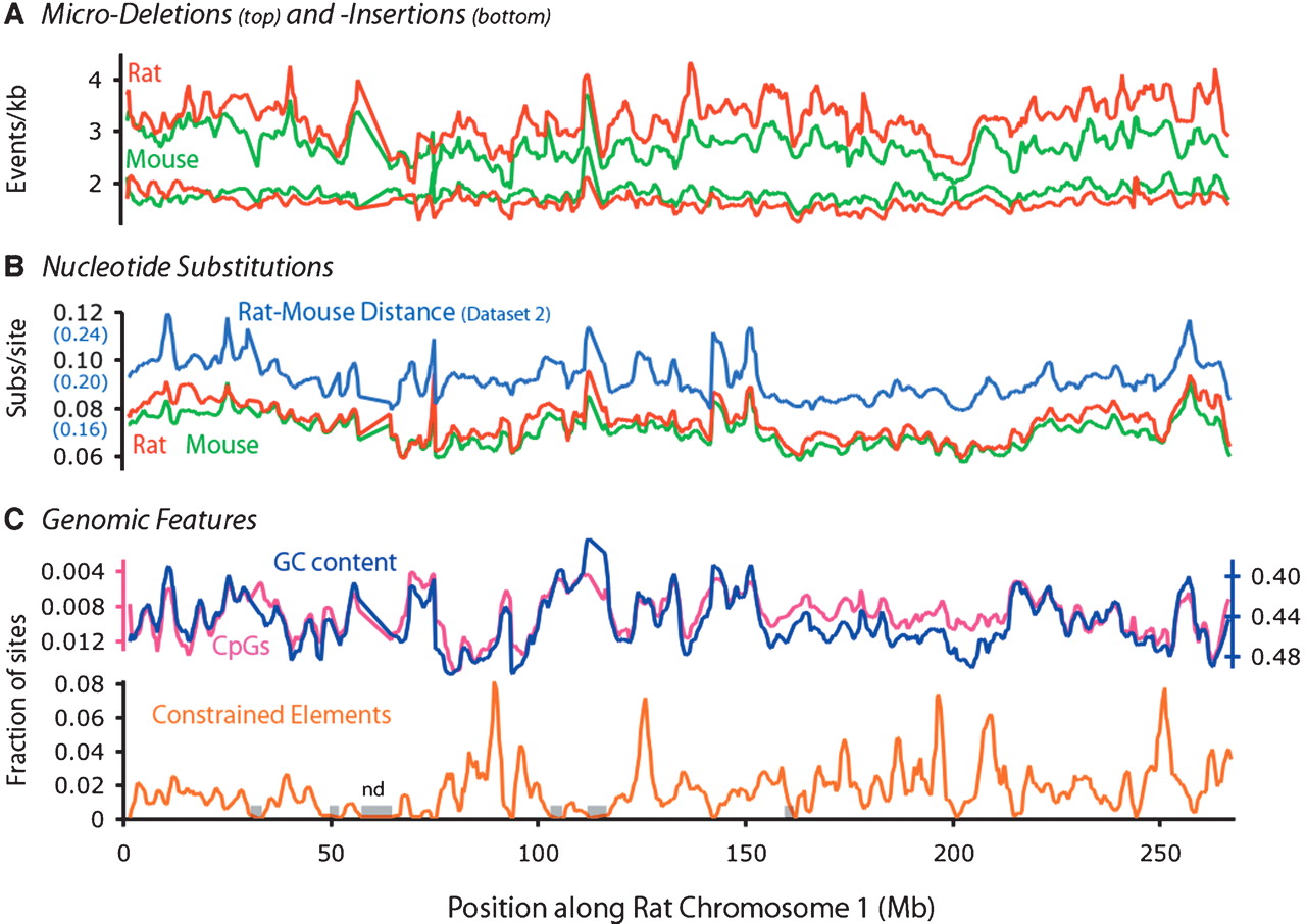 Variation of various evolutionary and genomic features along rat Chromosome 1. The X-axis for all plots is the genomic coordinates along rat chromosome 1 (draft v 3.1), in megabases. Regions in which no alignment data were available (applies to all plots) are marked as gray boxes (“nd”) directly on the X-axis. (A) Rates of microinsertion (top) and microdeletion (bottom), with mouse and rat in green and red, respectively. Note the correlations among all four lines, and especially between lineages (red vs. green). (B) Rates of nucleotide substitution for the rat and mouse lineages (red and green lines, respectively). The pairwise distance between mouse and rat as estimated from rodent-specific sites is in blue. Note the correlation between the red/green and blue lines, which originate from Datasets 1 and 2, respectively. (C) GC content and CpG density are in blue and pink, respectively. Y-axes, which are inverted to show the correlation with the rate of neutral point substitution, are colored accordingly. The density of constrained elements evolving at <20% of the local neutral rate is shown in orange, and shows no significant covariation with any of the other features analyzed.