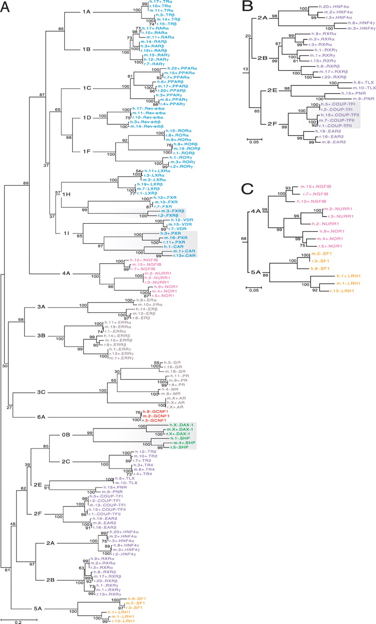 Unrooted phylogenetic trees of the NR family. The same color scheme for NR subfamilies is used as in Fig. 1. Group-level designations (e.g., 0B, 1A, 1B,..., 6A) label the interior branches, but common gene names label the terminal branches. Bootstrap values expressed in percentage are indicated at the nodes (branch bifurcations). (A) A complete tree constructed from the multiple sequence alignment of the LBDs of all NRs found in rat, mouse, and human. Shading highlights groups exhibiting rapid evolution. (B) NR2 subfamily clade (orphan receptors) taken from the DBD tree. Shading highlights a group exhibiting increased conservation. (C) Portion of DBD tree showing the relationship between subfamilies NR4 and NR5.