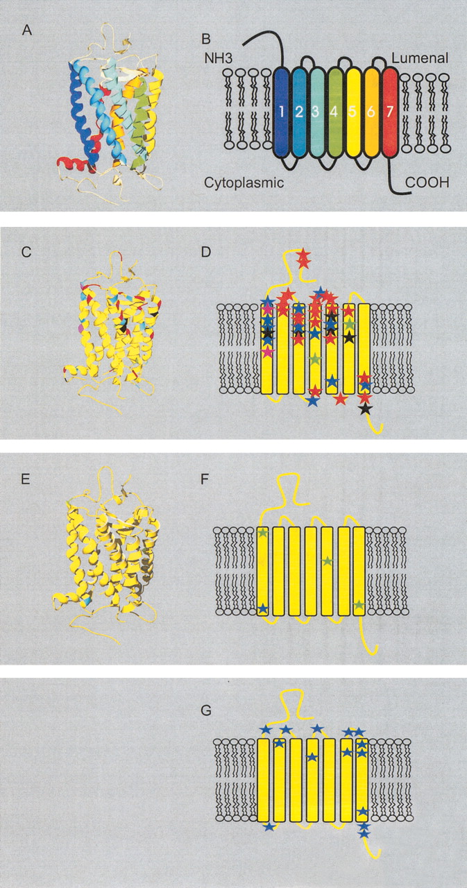 Site-specific KA/KS analysis of olfactory receptors, candidate testis odorant receptors, and V1Rs. ω+ codons that were predicted to be under positive selection are mapped to a ribbon representation of the structure of bovine rhodopsin (PDB 1L9H; Okada et al. 2002; for full details see Suppl. Table 2). (A) Ribbon diagram of bovine rhodopsin chain A colored by secondary structure succession. (B) Schematic representation of secondary structures. Ribbon diagram (C) and secondary structure schematic (D) of ω+ sites for olfactory receptors. ω+ sites predicted for OR family A are highlighted in green, B in black, C in purple, D in blue, and E in red. The analysis of these ORs indicates that positive selection appears to be confined largely to the lumenal half of the molecule. Seventy-five percent of the ω+ sites are located in the amino terminal region, extracellular loops, and the extracellular half of the transmembrane helices. Ribbon diagram (E) and secondary structure schematic (F) of ω+ sites for the candidate testis-specific odorant receptors (posterior probability > 0.99, in a single model). Three ω+ sites identified when analyzing the rat genes alone are highlighted in green. A single ω+ site identified in analysis of both the mouse and rat lineages is highlighted in blue. (G) Schematic of ω+ sites for the V1R family (posterior probability > 0.90 in one model and > 0.5 in at least one other model) highlighted in blue. The V1R proteins could not be reliably aligned to the rhodopsin sequence, and so positions of ω+ sites are relative to published predictions of secondary structures (Dulac and Axel 1995; Ryba and Tirindelli 1997). Swiss-PDBviewer (www.expasy.org/spdbv/; Guex et al. 1999) was used for all structural manipulations, and POVRAY (www.povray.org) was used to generate images.
