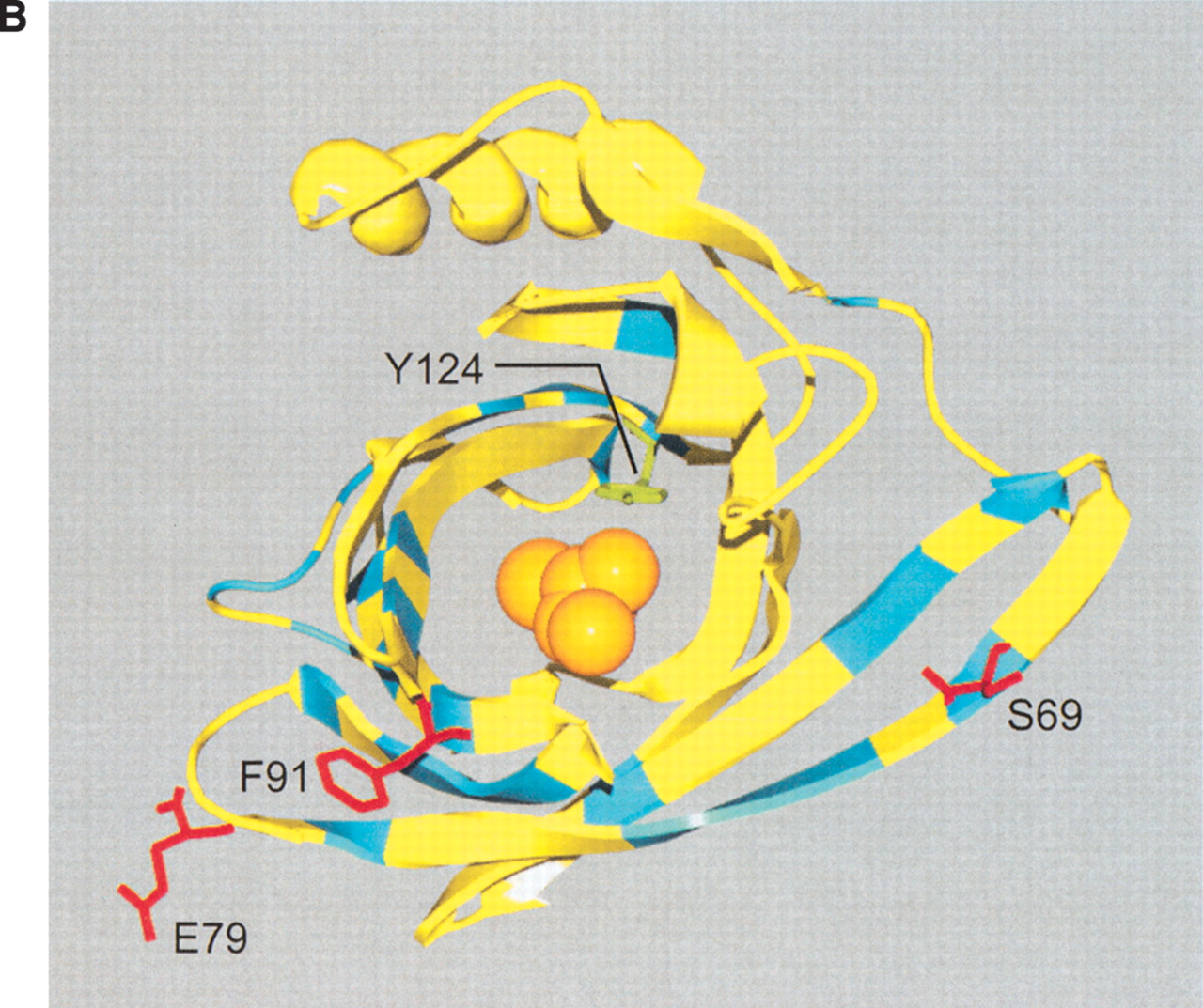 (A) Sequence divergence of rat α2u-globulin genes and pseudogenes. Genomic DNA from 22 rat α2u-globulin genes, including 12 suspected of being pseudogenes, identified as described in Methods. Nucleotide sequences were highly conserved (mean 93%±2% identity calculated from ungapped columns), and were aligned using HMMer (Eddy 1998) with manual adjustments. The proportion difference was calculated as the fraction of nucleotides in each column that differ from the consensus nucleotide. The average proportion difference from a sliding window of 10 nt is plotted against initial nucleotide position. Alignment columns with >50% gaps are shown as diamonds and were ignored for these calculations. Exons are shown as solid horizontal lines, with intron-exon boundaries defined by dashed vertical lines. (B). Site-specific KA/KS analysis of the MUP/α2u-globulin family, lipocalin homologs. ω+ codons with a posterior probability >0.90 by one codeml model, and >0.5 by at least one other model, are shown mapped to the crystal structure of murine MUP complexed with 2-(Sec-butyl) thiazoline (PDB 1MUP; Bocskei et al. 1992). Residues corresponding to ω+ codons are highlighted in blue; 2-(Sec-butyl) thiazoline is shown in orange. A single interior ω+ site corresponds to 1MUP:Y124 (shown in green). Although there are no data available to support a direct role in binding, this tyrosine residue neighbors, and has a similar orientation to, 1MUP:R126, which is required for thiazoline-binding (Bocskei et al. 1992). Y124 is as close to 2-(Sec-butyl) thiazoline as 1MUP:F60, a proposed ligand-binding residue (Darwish Marie et al. 2001). All mouse, and most rat, sequences contain a tyrosine in the position equivalent to 1MUP:Y124. However, two rat genes (mup_rn11 and mup_rn20) possess substitutions (to leucine and tryptophan, respectively) that might modify the geometry of the internal ligand-binding cavity. Consequently, these two genes might have evolved either to bind a ligand different from those of their paralogs, or else the same ligand with a different affinity. We also identified three codons (1MUP:S69, E79, and F91) that have been subject to rat lineage-specific positive selection. These are shown here in ball-and-stick format and colored red. These sites are the only alignment positions where amino acid substitutions are not conserved in rat α2u-globulins but are conserved in mouse MUPs. One rat α2u-globulin (mup_rn5) possesses unusual substitutions at all three positions (for S69, two substitutions at second and third codon positions [R→T]; for E79, a first position transversion [P→A]; and for F91, a second position transition G→E). mup_rn18 shares the R→T substitution at S69 with mup_rn18. This suggests that at least three sites in α2u-globulins may be under positive selection in the rat lineage alone, possibly reflecting the functional divergence of two genes (mup_rn5 and mup_rn18) from the other rat paralogs.
