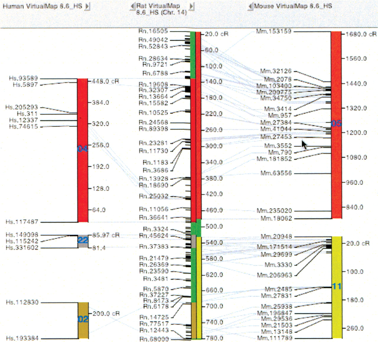 Display of rat Chr 14 (center) and syntenic regions in human Chr 4, 22 and 2 (left) and mouse Chr 5 and 11 (right).