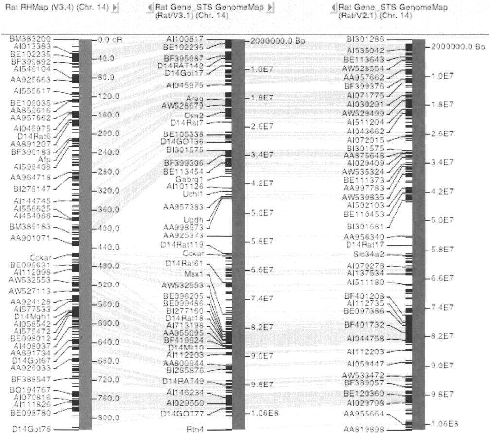 Current rat genome build (version 3.1) and earlier builds can be aligned with either genetic maps (data not shown), previous genome assemblies (version 2.1 shown), or the radiation hybrid map (RH 3.4) for overall review and quality control.