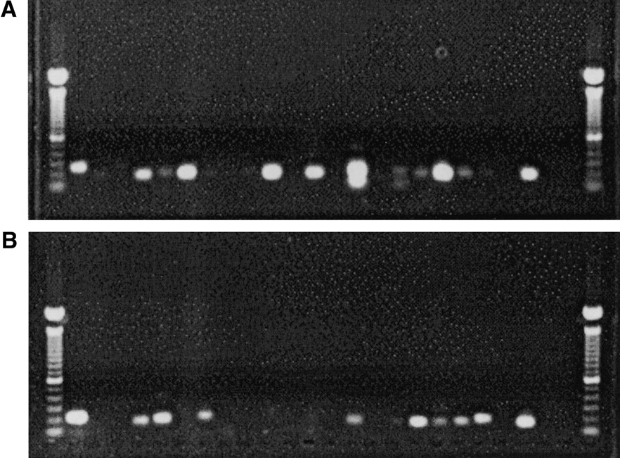 Gels used as part of RT-PCR validation of predicted introns. RT-PCR was used to validate one intron from 48 predicted novel human genes and their simultaneously predicted rat orthologs. The gels contain the RT-PCR sequenced products from human (A) and rat (B). Each column in the gel contains the sequenced product for one intron tested, with the same columns in the human and rat gels containing products from orthologous predictions. The leftmost and rightmost columns contain the ladders used to determine the lengths of the sequenced products. The second column contains a positive control (RT-PCR of an exon-pair from actin), and the third column contains a negative control (no reverse transcriptase used).