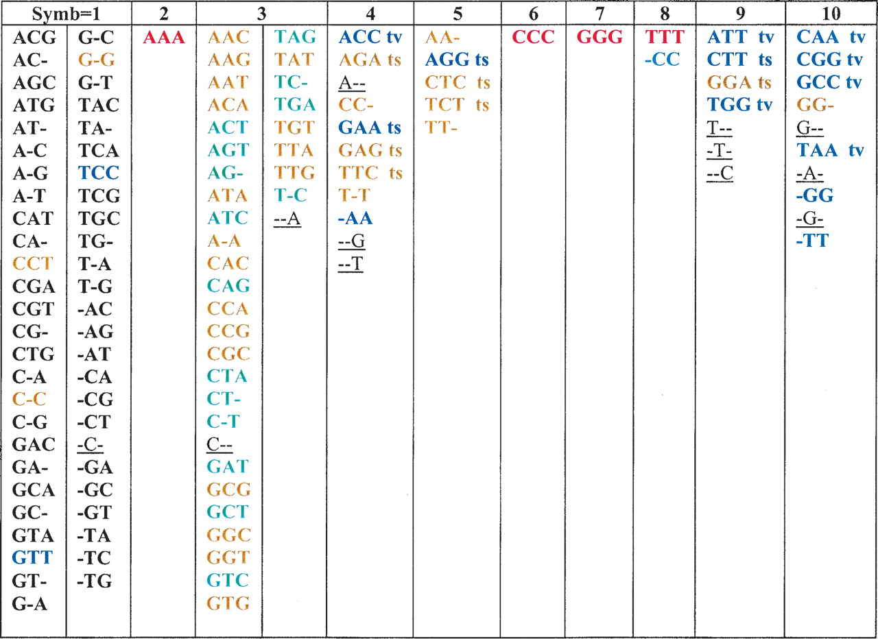 In the triplets, first, second, and third positions correspond, respectively, to human, mouse, and rat. (Underlined) one species and two gaps. (Black) very rare triplets; two mismatching species and one gap, or three mismatching species. (Green) more triplets with two mismatching species and one gap, or three mismatching species. (Brown) triplets with human matching one of the rodents, and the second rodent mismatching or gapped. (Blue) triplets with rodents matching, and human mismatching or gapped. (Red) matches of all three species. (tv and ts) Near triplets in Symbols #4, #5, #9, and #10 indicate transversions and transitions, respectively.