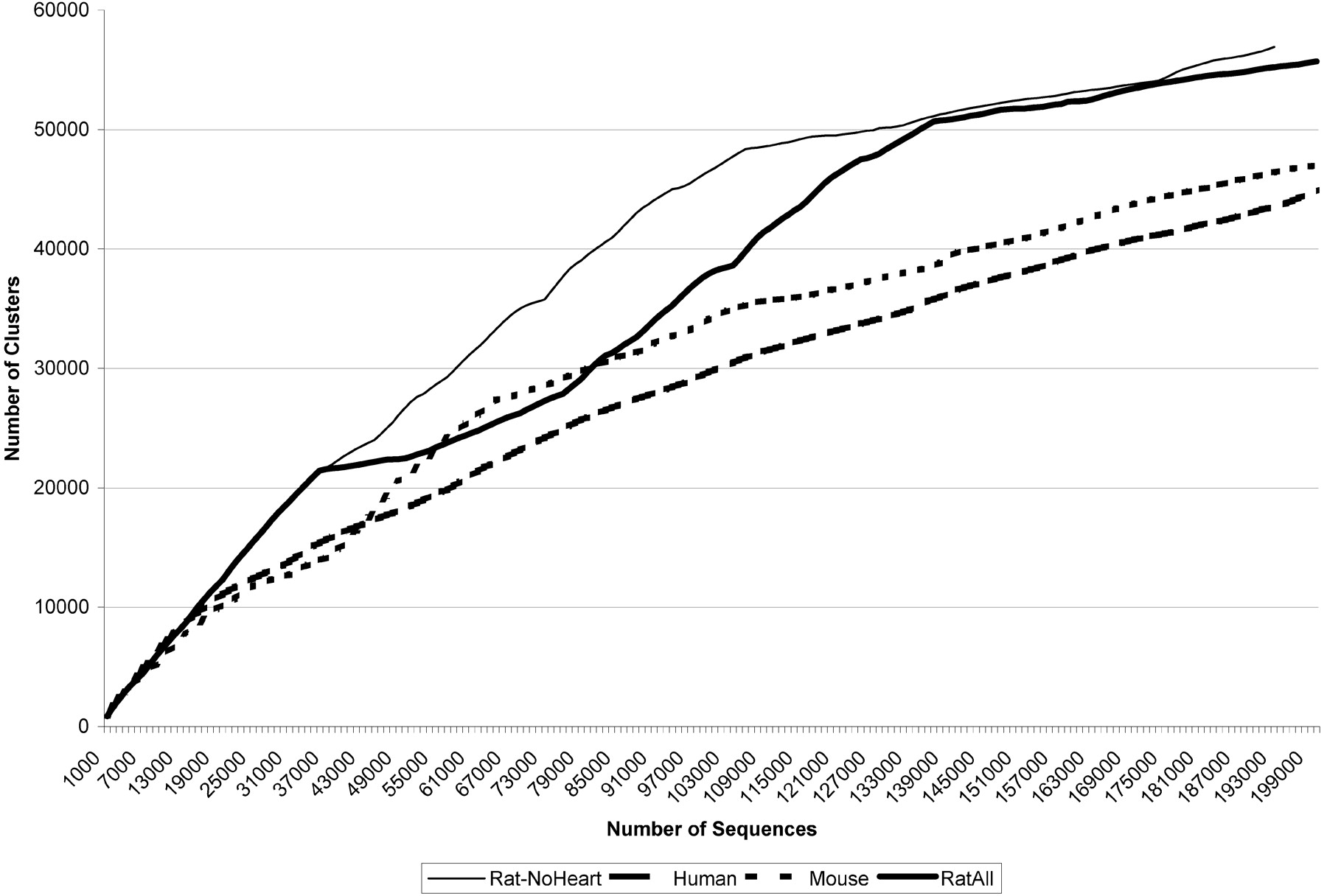 Gene discovery in rat, mouse, and human. Discovery per 1000 sequences is presented to compare the rates of EST-based gene discovery among human, mouse and rat. The rat discovery rate is presented with and without the rat heart libraries to demonstrate the power of focused gene discovery with normalization and serial subtraction of cDNA libraries.
