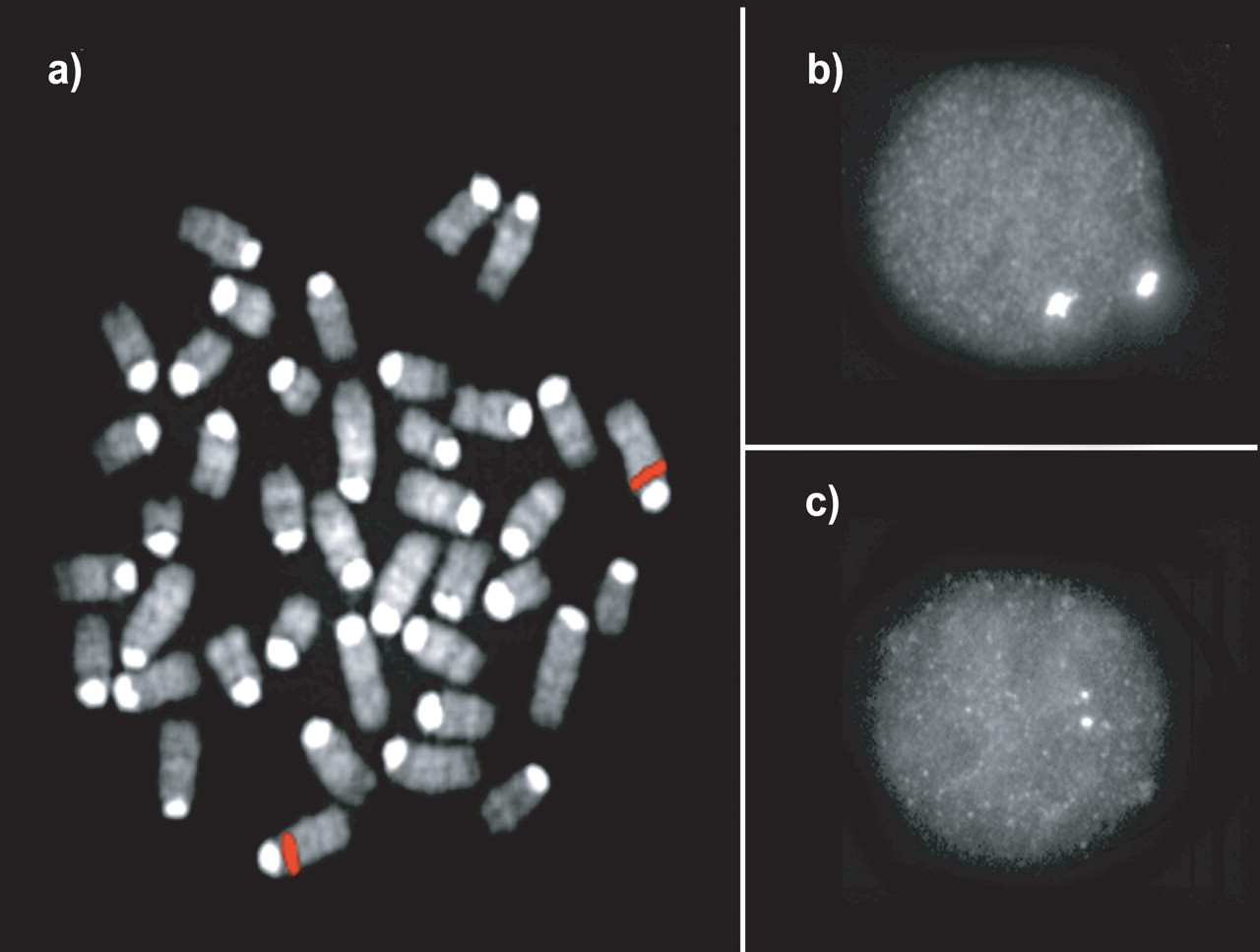 FISH confirmation. An example of (a) metaphase and (b) interphase FISH hybridization with a duplicated BAC clone (RP23–3D2; see Table 4) that was identified by the whole-genome shotgun detection strategy. Increased signal intensity was confirmed using (c) cohybridization with a unique probe (RP21-344N12) in the same nucleus as shown in b. Tandem segmental duplications were most frequently observed (Table 4). The results of all FISH experiments are available online (http://www.biologia.uniba.it/mouse/).