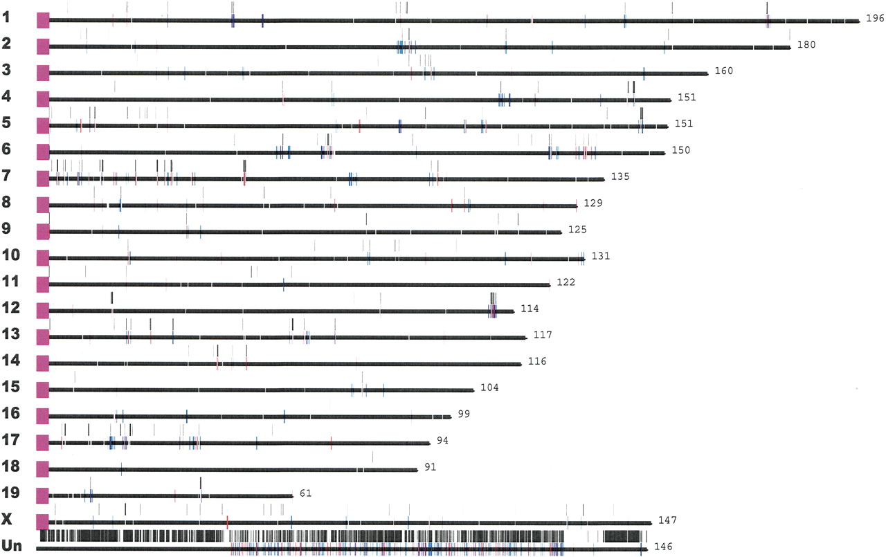 Mouse segmental duplications. Segmental duplications detected by whole-genome shotgun sequence detection (WSSD, black bars) and whole-genome analysis comparison (WGAC, red/blue bars) are drawn to scale within the published mouse genome assembly (MGSC 2002). Chromosome lengths and the centromere positions are shown in purple. These data are available as part of an interactive mouse segmental duplication database (http://mouseparalogy.cwru.edu).