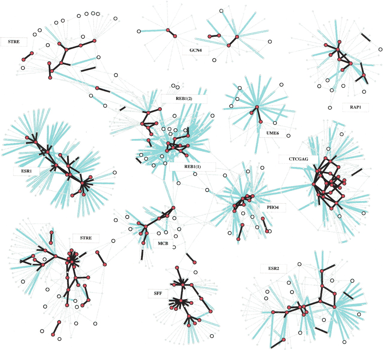 Partial view of the selection network. Motifs are represented as circles; motifs that have conservation rate >0.2 at 2 SD are drawn as large circles, motifs with conservation rate >0.2 at 3 SD are shown as large filled circles. Substitutions are shown as color-coded arcs. Black, nonnegative substitution rate (ρ > 0 and ρ > -0.5 at 2 SD); cyan, negative rates (ρ < -0.5 at 2 SD). A family in the selection network is a cluster of motifs that are interconnected via high or neutral substitution rate arcs. Low-rate substitution arcs separate families. Arc directions are not shown for readability, but 91% of the negative rate arcs point from a family motif to a motif outside the family. We annotated each family by a consensus motif, and by the names of the transcription factors that match that consensus (if such are known). Many known transcription factors are identified as families of motifs, some of which are shown in this figure. Families can be further analyzed for intricate intrafamily relations. Certain transcription factors (e.g., Reb1) correspond to more than one family due to multiple functionalities, as discussed later. Transcription factors with binding sites that are less frequent in the genomes (e.g., Gcn4) have larger variance on rate estimations, and thus are harder to cluster robustly. An interactive version of this figure is available on our Web site.