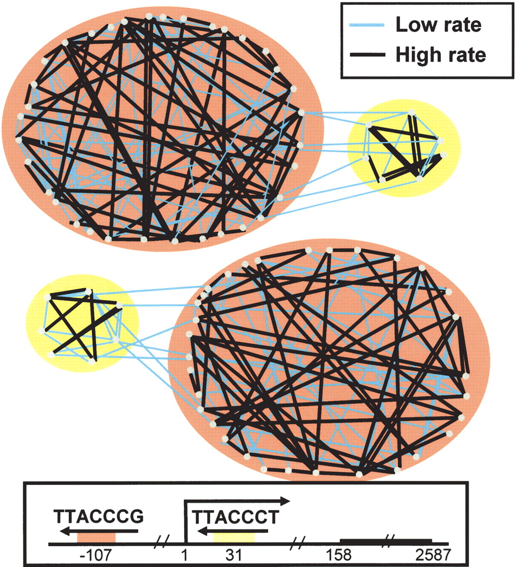 Multimodality of the Reb1 transcription factor. A part of the selection network containing motifs that are associated with Reb1 is shown in greater detail. All nodes represent variants of the Reb1 consensus. Note that in this figure, all selection network arcs, including those with low confidence, are plotted, and reverse complement motifs are not combined. (A) Reb1 motifs. (B) Reb1 reverse complementing motifs. Black arcs represent high substitution rate (low selective pressure). Blue arcs represent low substitution rate (high selective pressure). A clear two-family structure emerges, where low-rate arcs are separating a large Reb1 family from a smaller one. The structure is mirrored in the reverse complement motifs. The Reb1 promoter (C) contains two autoregulatory sites, each located in a different family, with distinct binding site affinities (Ideker et al. 2001). This raises the hypothesis of two distinct Reb1 modes of operation, each activating a different group of motifs in specific concentration. Note that nodes in the network are octamers and that the Reb1 consensus is a septamer.