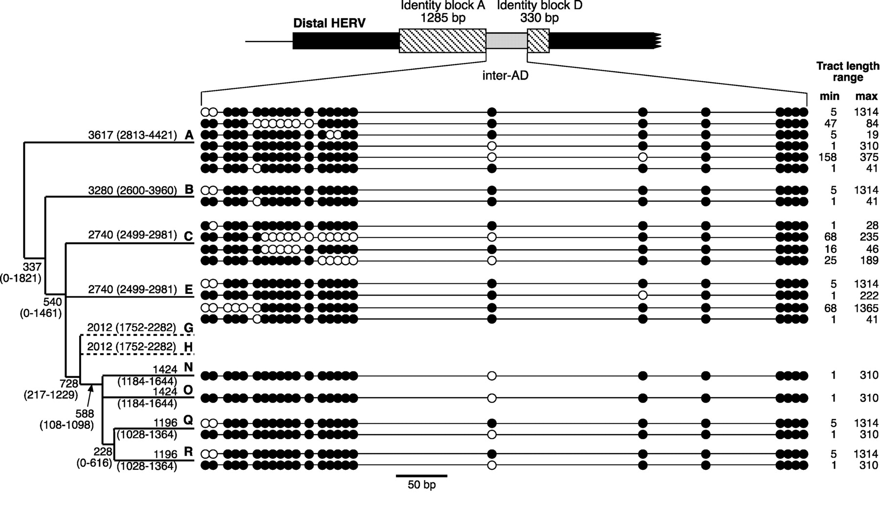 Number of independent proximal-to-distal conversion events within the sample. Sequence states of the PSVs within the distal inter-AD segment are shown schematically as small filled or empty circles and are defined as proximal or distal specific according to the reference sequence; spacing is approximately to scale. Each horizontal line represents one independent event, as deduced from the sequences shown in Fig. 2. The phylogeny to the left shows the haplogroup within which each event occurred and, adjacent to branches, the estimated age in generations (and its range as ±SD) of each branch, taken from published dates (Hammer and Zegura 2002) and assuming a generation time of 25 years. Branches G and H are included, even though they contain no conversions, because their ages are required in the rate calculation. Branches D and J are omitted because their lack of PSVs makes them uninformative.
