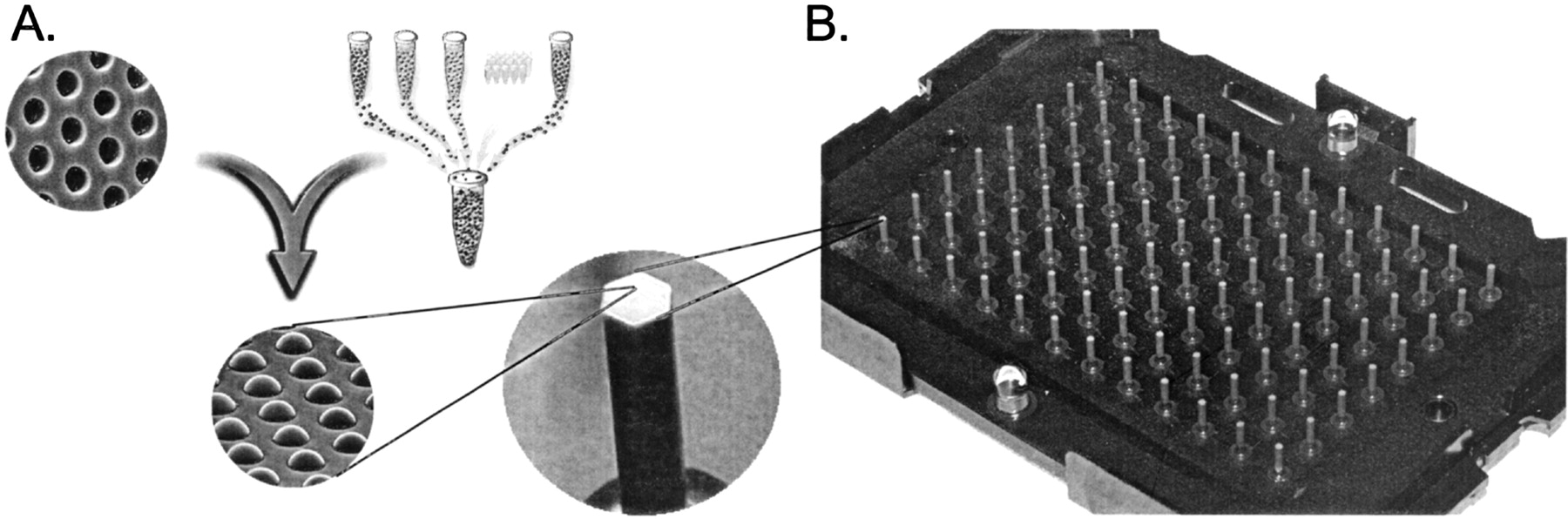 Assembly of a random array. (A) Creation of a bead pool and assembly into ∼3-μm-diameter wells etched in optical fiber bundles. Once a bead pool is made, it is relatively straightforward to assemble and decode large numbers of arrays. Each array contains ∼50,000 beads distributed among 1520 bead types, so that each bead type is represented at ∼30-fold redundancy. Scanning electron micrographs are shown of an unassembled and an assembled array containing one bead per well. (B) Because individual arrays are only ∼1.4 mm in diameter, they can easily be arranged into a 96-array matrix, designed for parallel analysis of samples in standard microtiter plates.