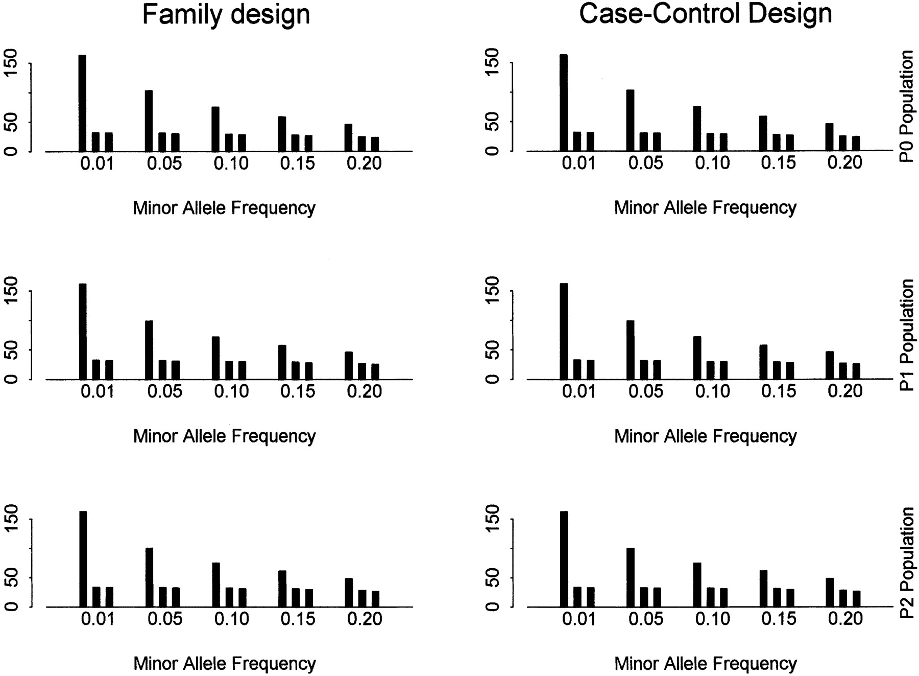 The number of SNPs and tag SNPs for different minor allele frequencies with α = 80% and β = 10%. The SNP density is set as one SNP per kilobase. In each bin (i.e., for each minor allele frequency), it shows the number of (from left to right) (1) all SNPs for block partitioning and tag SNP selection; (2) tag SNPs identified by the haplotype data; (3) tag SNPs identified by the genotype data.