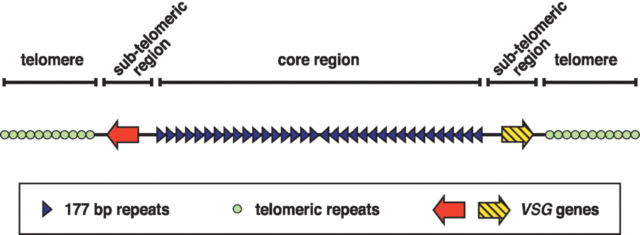 A canonical structure for the MCs of T. brucei. The core region is a large repetitive palindrome produced by direct head-to-tail repeats running from both subtelomeres to a central inversion point. Subtelomeric regions contain nonrepetitive regions, at least some of which are VSG genes. Short subtelomeric repeats are capped by telomeres of equivalent size and sequence to those of the large housekeeping chromosomes. The structure of ICs is analogous, but contains larger, more complex subtelomeric regions.
