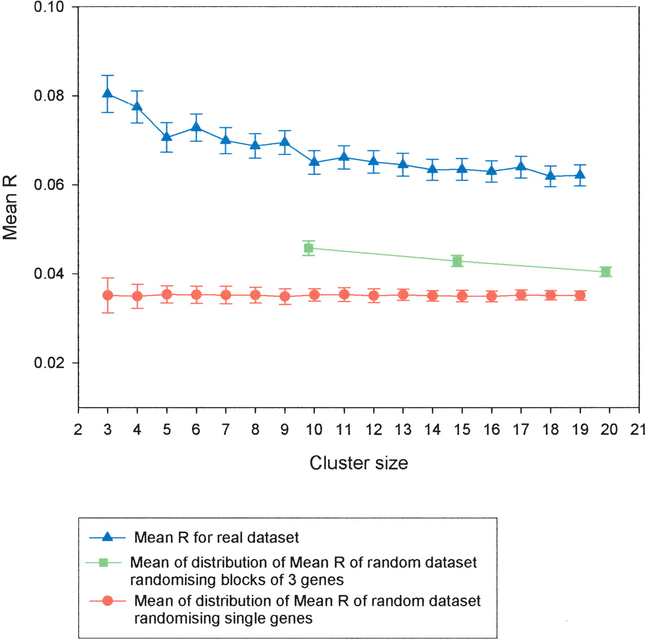 Using the Affymetrix data set lacking tandem duplicates, the mean R for nonoverlapping windows of neighboring genes (three to 20 genes in size) was plotted against cluster size (blue line). The Mean R from 100 random sets of gene clusters (three to 20 genes in size) was also plotted (red line).
