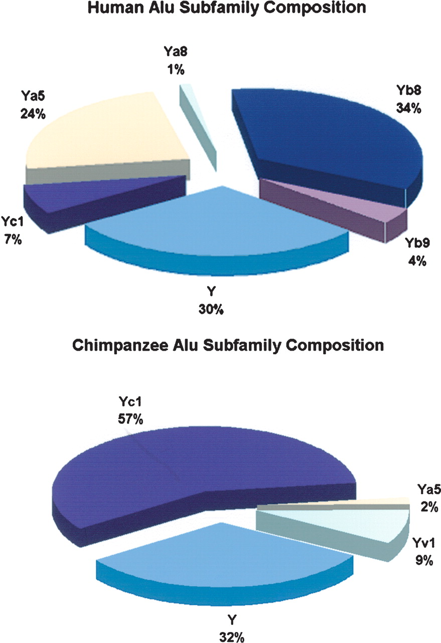 Subfamily composition of lineage-specific Alu insertions in humans and common chimpanzee.