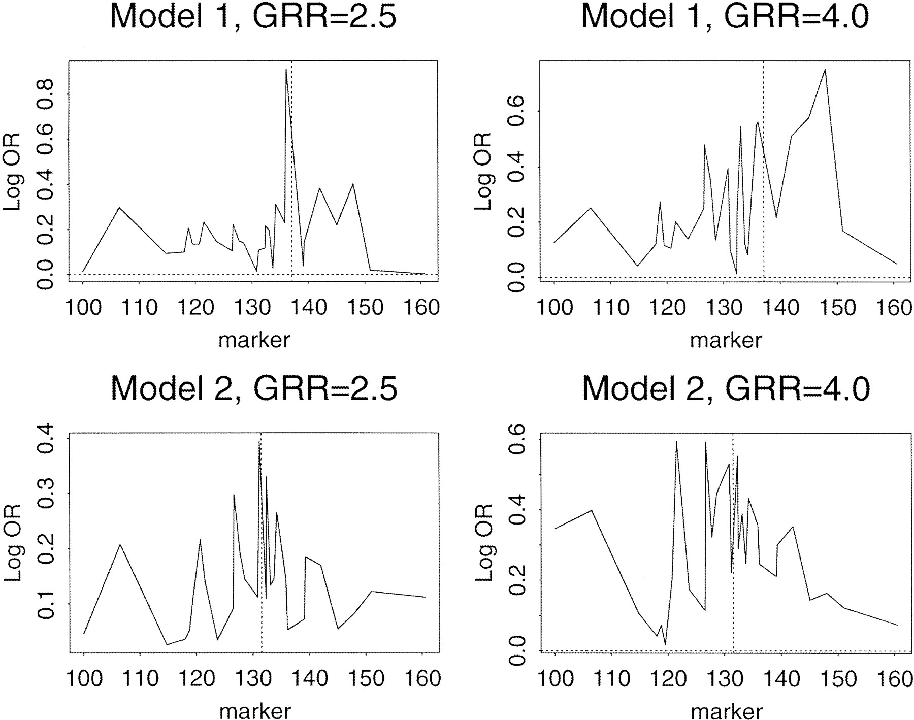 Log odds ratio comparing the alleles of simulated cases and controls. The panels show the results for each of the 29 markers and the same models described in Figure 2. The alleles for each marker were compared between the cases and controls for each of the models. The log odds ratio of the associated allele (either allele 1 or allele 2) is shown on the ordinate and the cM position on the abscissa. The position of the markers used for model 1 and model 2 are as indicated by the vertical dashed line.
