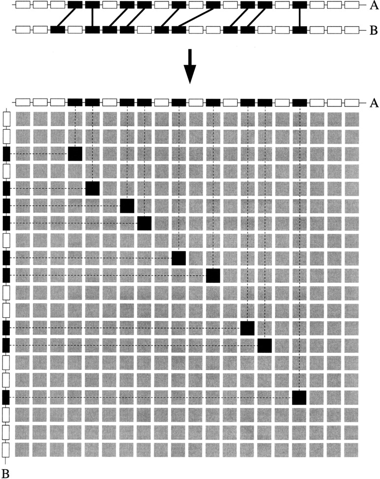 Construction of a gene homology matrix (GHM). The top section shows two collinear genomic segments A and B. Every box denotes a gene. The black boxes connected by lines represent pairs of homologous genes (anchor points). The bottom section shows the actual GHM derived from these two segments. Every column represents a gene of segment A, whereas every row corresponds to a gene of segment B. A cell will contain a nonzero value (i.e., is marked in black) if the gene products of the corresponding row and column are homologous to each other.