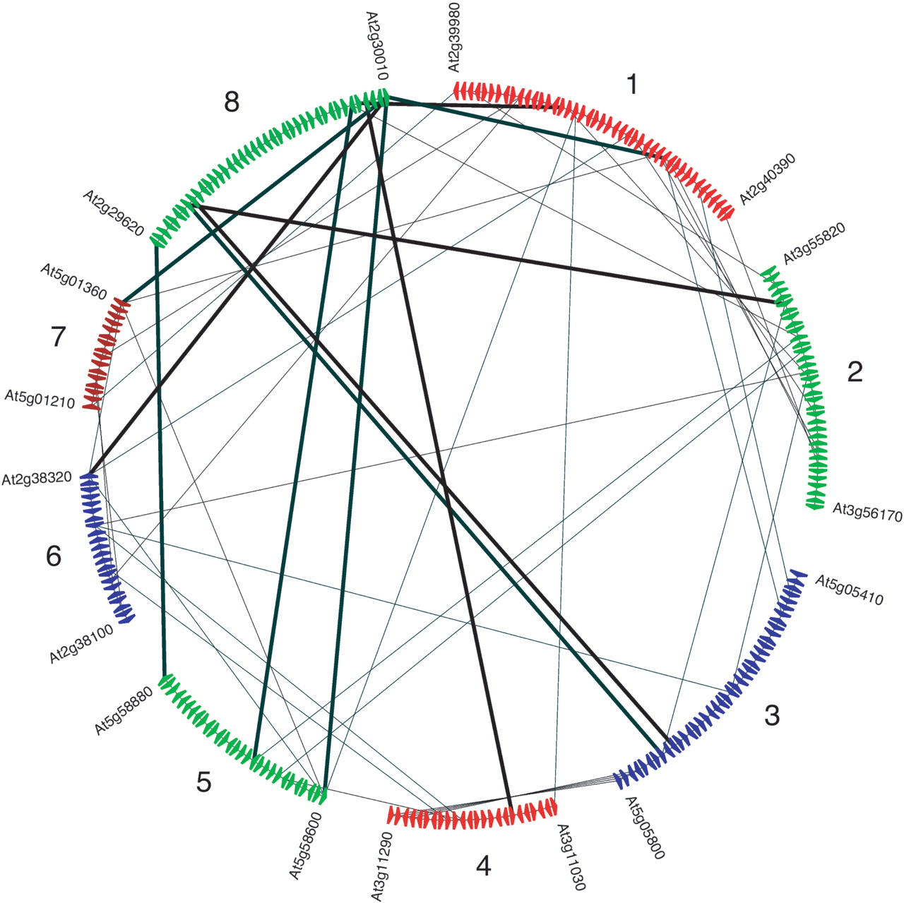 Example of a multiplicon with a multiplication level of 8 in the genome of Arabidopsis. Each colored triangle on a segment represents a gene. The different segments in this multiplicon are indicated with the locus numbers of their first and last gene. The segments are displayed in the chronological order in which they were added to the multiplicon. See the Discussion section for more details. The lines connect pairs of homologous genes; the homology relations with segment 8 are indicated with thick lines.