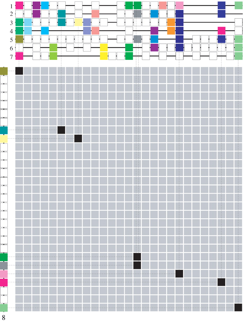 Gene homology matrix (GHM) for the multiplicon shown in Figure 7. The segment numbers correspond to the same segments as in Figure 7. The boxes on the segments represent genes. Genes of the same color are homologs. Tandemly duplicated genes have been remapped (data not shown). Segments 1–7 (above the matrix) are aligned to form a profile. Empty positions on the segments denote gaps in the aligment (see Methods section for details). Using this profile, the homology relationship between segment 8 (left of the matrix) and the other segments in the profile/multiplicon can be established because segment 8 is clearly homologous to the profile (see Discussion for more details).