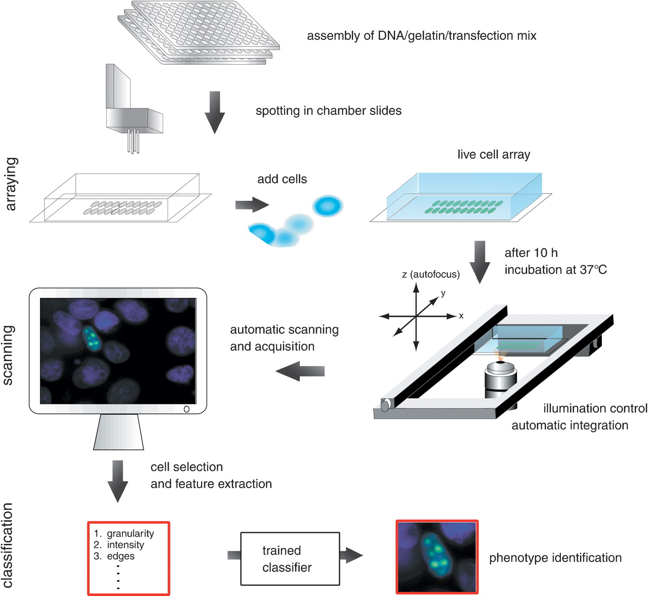 Workflow of phenotype classification system. The mix of targeted DNA (e.g., subcellular clones–GFP fusion), gelatin, and transfection reagents are prepared in microwells and spotted in arrays into chamber slides by a DNA-spotting robot. Cultured cells are added to the chamber slides and transfected with the DNA on the arrayed spots. After 10 h incubation at 37°C the fluorescence signal of the expressed GFP signal can be visualized. On the automatic scanning platform a motorized stage and motorized z-stepper perform the scanning of the live cells. The control of the illumination and the automatic calculation of the integration time allow an automatic acquisition of cell images. Cells with GFP-signals are captured and image features are extracted. These features serve as input for training of the automated classification system.