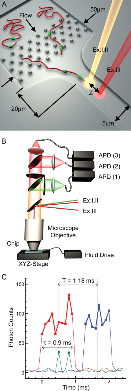 Schematics of the Direct Linear Analysis (DLA) technology. (A) A cross-section of the microfluidic DNA stretching microchip (top). A typical design, one of a few, is presented. See text for the exact parameters of the chip used in this study. (B) Optical scheme (side view). The excitation and detection are arranged within a confocal fluorescence microscope. The excitation laser beams are directed into the microscope objective with a dichroic mirror that reflects the light with 532 nm (beam ExI) and 633 nm (beams ExII and ExIII) wavelengths, but is transparent to the fluorescence emission excited by these beams. The emission is further split by another dichroic mirror and bandpass filters. Fluorescence excited by the green laser is delivered by optical fiber to the photon-counting avalanche photodiode (APD) for signal detection in data channel 1. Fluorescence excited by red beams ExII and ExIII is directed to the APDs of data channels 2 and 3, respectively. (C) Typical raw data traces from data channels 1–3 for a single tagged DNA molecule. The red and blue traces arise from fluorescence of the intercalating dye when the DNA backbone travels through the excitation spots ExII and ExIII, respectively. The green spikes are detected when the DNA-bound PNA tags pass through the excitation spot ExI and emit bursts of photons.