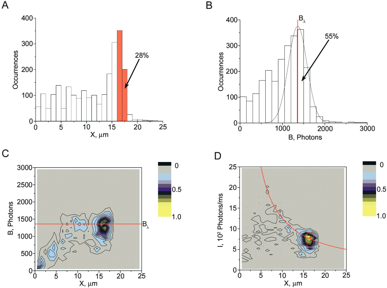 Properties of detected molecules of λ phage DNA (48.5 kb) in a representative experiment. (A) The distribution of DNA lengths (sizes of DNA projections X onto the movement direction) for detected DNA molecules. (B) The distribution of burst sizes B (total number of photons per detected molecule) of the stained DNA backbone (data channel 2). The peak corresponding to full-size λ DNA is interpolated with a best fit Gaussian curve. Scatter plots of burst size B vs. DNA length X (C) and of average intensity of DNA backbone I vs. X (D). C and D include points representing single observed DNA molecules stained with the TOTO-3 intercalating dye. Because the points are concentrated in small regions, we have chosen to present their color-coded density rather than the points themselves. The solid red lines in C and D correspond to the center of the Gaussian distribution Bλ interpolating the full-size DNA molecules shown in B. A total of 2373 individual molecular traces are represented in this data file. The data points included in the red box in D were used to calculate one of the DNA maps presented in Figure 3D. This selection contains ∼400 molecules. The corresponding interval, including molecular traces with projections between 16.25 and 17.25 μm, is outlined in red in A.