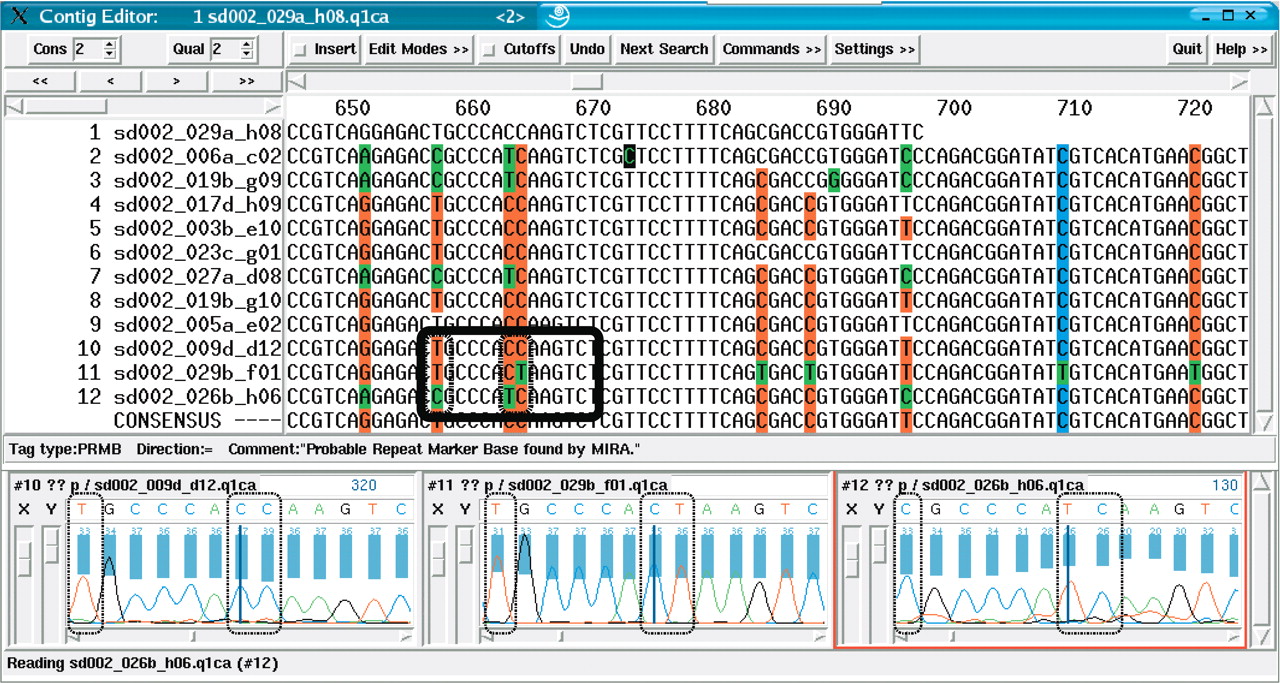 Snapshot of a contig in the sequence assembly after the first iteration (visual representation by means of the gap4 program). All sequences were assembled together. After the assembly, miraEST searched for unresolved mismatches with good signal qualities, tagging entire columns as dangerous potential SNP sites for the next iteration. miraEST tagged strong SNP sites bright red, weak sites in blue; bases differing from the consensus are shown in green by the gap4 program. Some bases were not tagged, although they cover a possible SNP site; these bases generally have trace signals of bad quality that the assembler deemed to be too dangerous to be taken as differentiation criterion. miraEST will dismantle that contig and reassemble the sequences immediately, this time using the information gained about the potential SNP sites in the previous assembly to correctly discern between different mRNA transcripts having different SNP variants. The black rectangle amidst the sequences depicts the three trace signal extracts that have been exemplarily shown below; the smaller black boxes within the rectangle depict the discrepancy bases that have also been surrounded by black boxes in the traces. All sequences have indisputable trace curves and quality values (shown as a blue bar above the traces). One can clearly see that there will be at least three different mRNA transcripts to be built, on the basis of the double-base mutation in the middle of the box, one reading CC, the next CT, and the last TC.