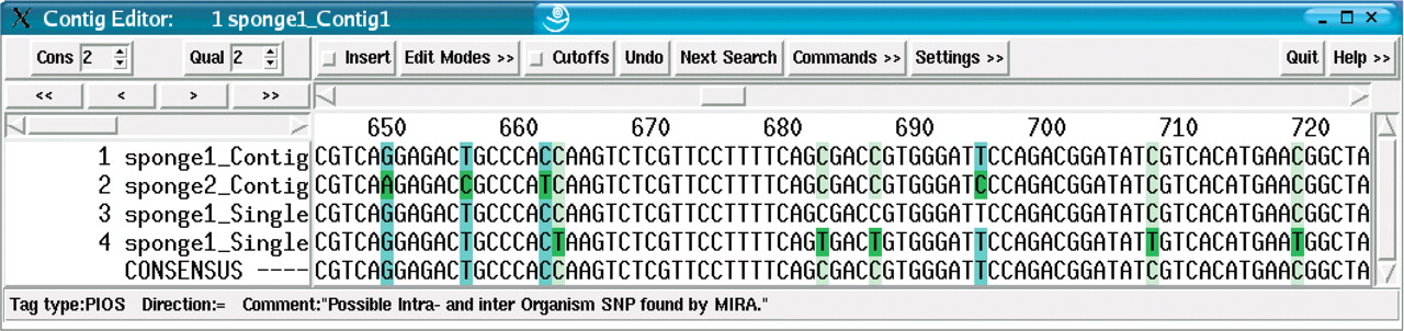 The last (optional) step of the EST assembly consists of the input sequences being given strain information to show the effect when two different organism strains (named sponge1 and sponge2) are sequenced and analyzed. In this example, miraEST classified the SNPs into two categories: PROS (shown in light blue) for SNPs that occur only between strains/organisms (e.g., column 661) and PIOS (shown in light green) for SNPs that occur both within a strain as between different strains (e.g., column 662). Interestingly enough, most of the SNPs shown in this example will not cause a change in the amino acids of the resulting protein, with one notable exception, the SNP of sponge1_singlet4 at base position 662 causes a TAA codon to be expressed, which is a stop codon. The SNPs of the same sequence at position 686 and 707 would cause mutations in the amino acid sequence, but are, because of the TAA mutation earlier, in the3′ UTR of this particular mRNA transcript.