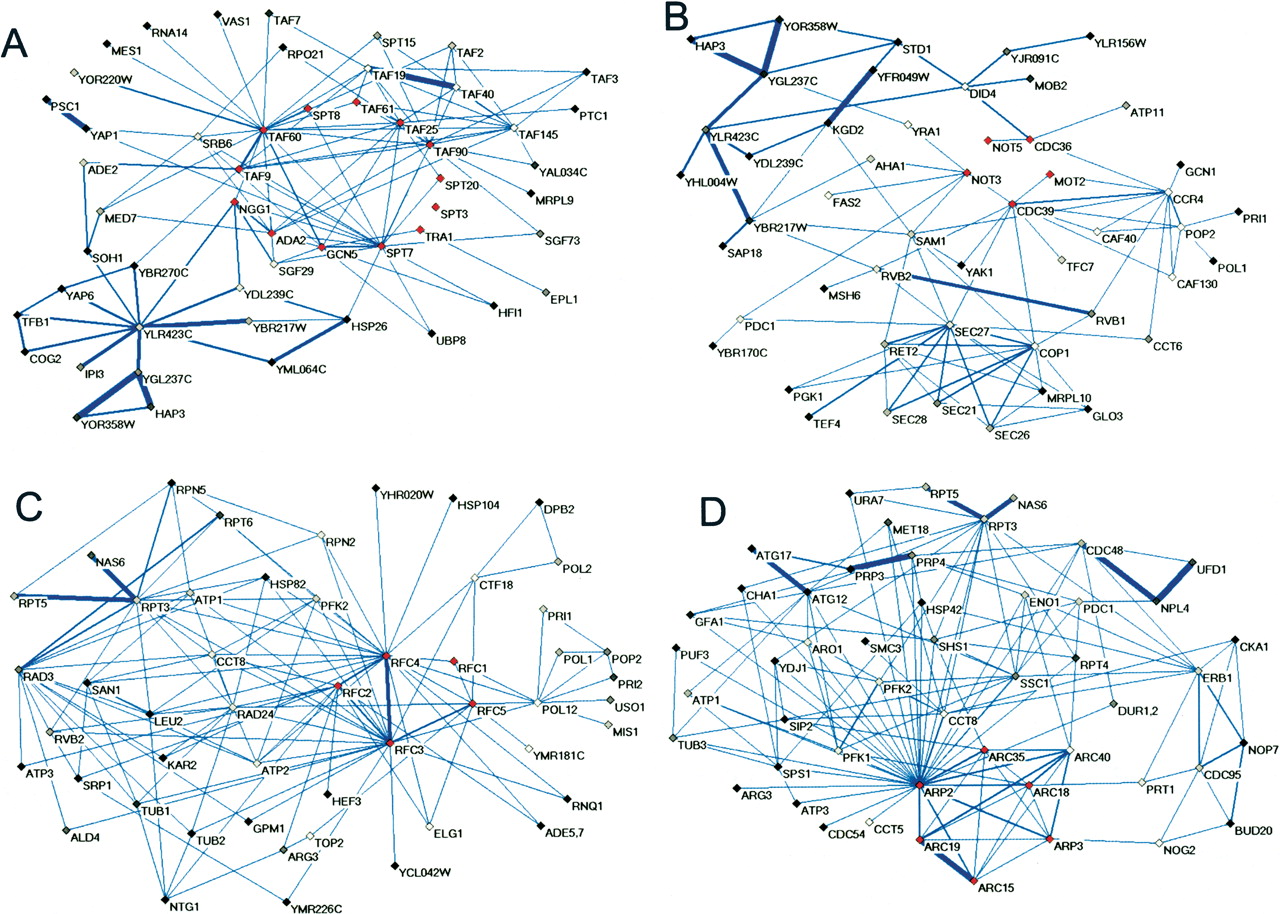 Results of several examples using MIPS complexes (Mewes et al. 2002) as “core complex” queries. Probabilistic interaction subgraphs are visualized by the software Pajek (Batagelj and Mrvar 1998). Query proteins are marked in red, and the top 50 proteins returned are colored in grayscale according to rank, with lighter coloring indicating better rank. Each edge is given thickness proportional to its posterior probability. Shown are SAGA complex (A), NOT complex (B), replication factor C complex (C), and the Arp2/Arp3 complex (D).