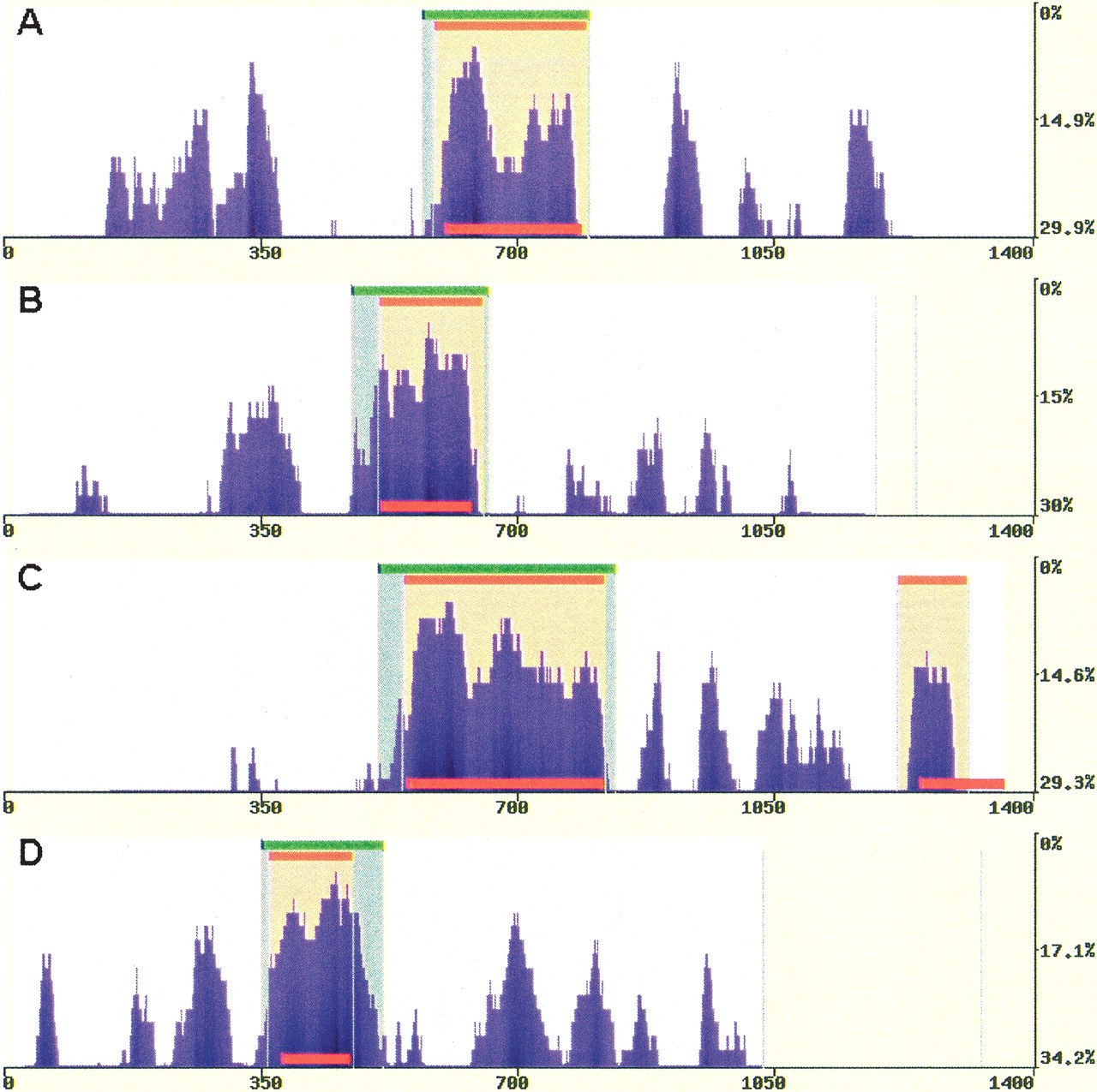 Predicting exons in multiple primate alignments. eShadow exon prediction and conservation plots for ApoB (1.4 kb) (A), Plasminogen (1.2 kb) (B), LXR-α (1.35 kb) (C), and CETP (1 kb) (D) loci using multiple primate alignments. HMMI predictions (0.85/0.77/0.1) are in beige and DT regions (15/100) are in green. The locations of known exons are depicted as red bars. Sequences are available at NCBI (accession nos. AY190030–AY190042, AY192729–AY192785).