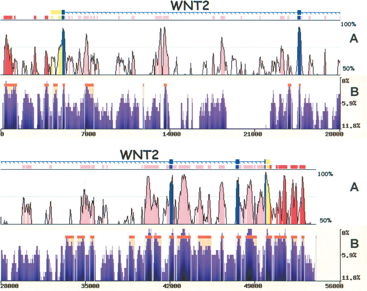eShadow analysis for the WNT2 region. Human/mouse conservation plot (A) compared with human/baboon/chimp eShadow conservation plot (B). Human/mouse alignments were generated and visualized by the zPicture program (http://zpicture.dcode.org), using standard parameters (≥ 100 bp; ≥ 70%) and conserved elements corresponding to exons (blue), UTRs (yellow), intronic (pink), and intergenic (red) elements are indicated (A). Human/baboon/chimp alignment plot (B) depicting regions of conservation (purple) and HMMI predictions (beige). y-axis corresponds to percent identity (A) and percent variation (B). x-axis corresponds to size in base pairs (A,B).