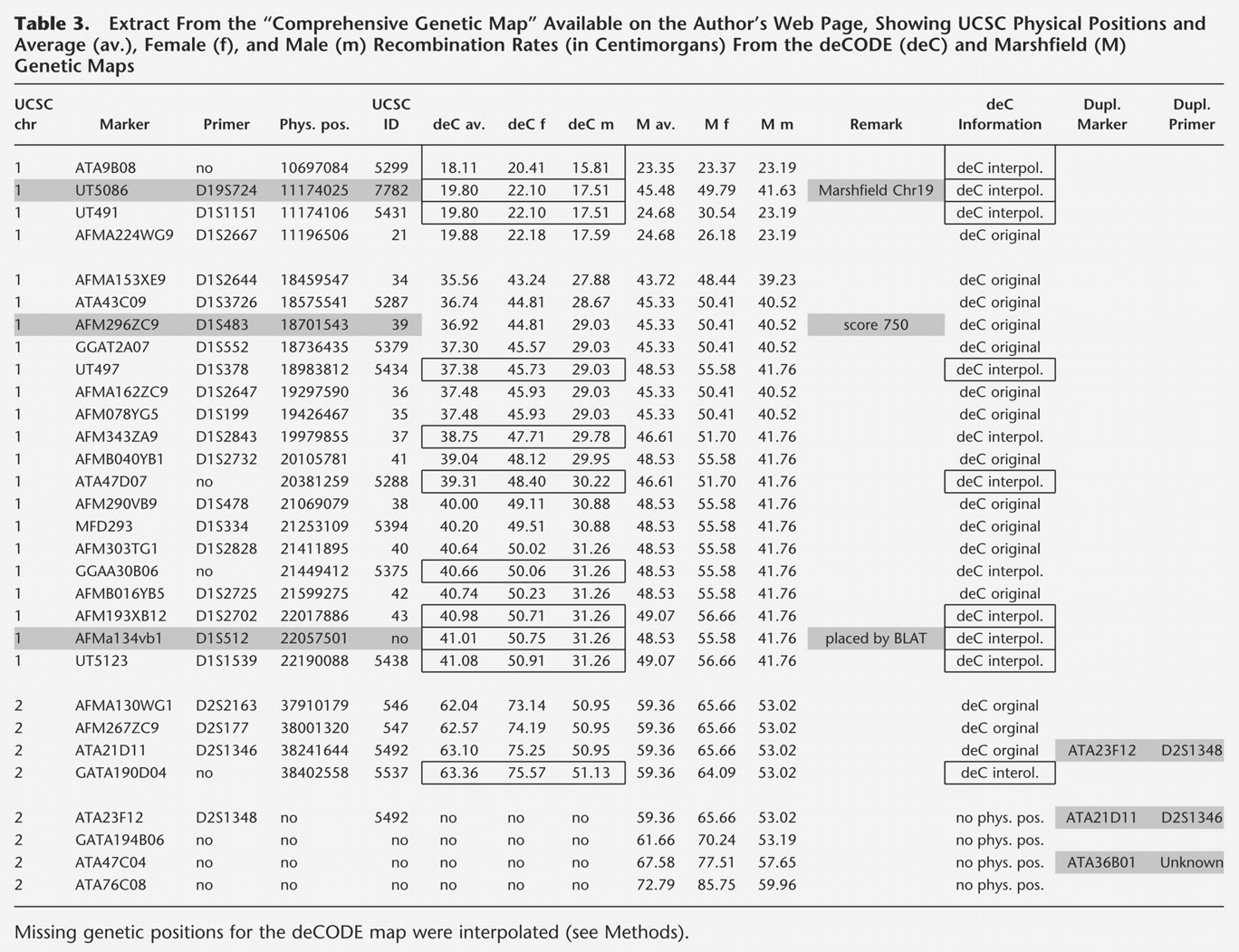 Extract From the “Comprehensive Genetic Map” Available on the Author's Web Page, Showing UCSC Physical Positions and Average (av.), Female (f), and Male (m) Recombination Rates (in Centimorgans) From the deCODE (deC) and Marshfield (M) Genetic Maps