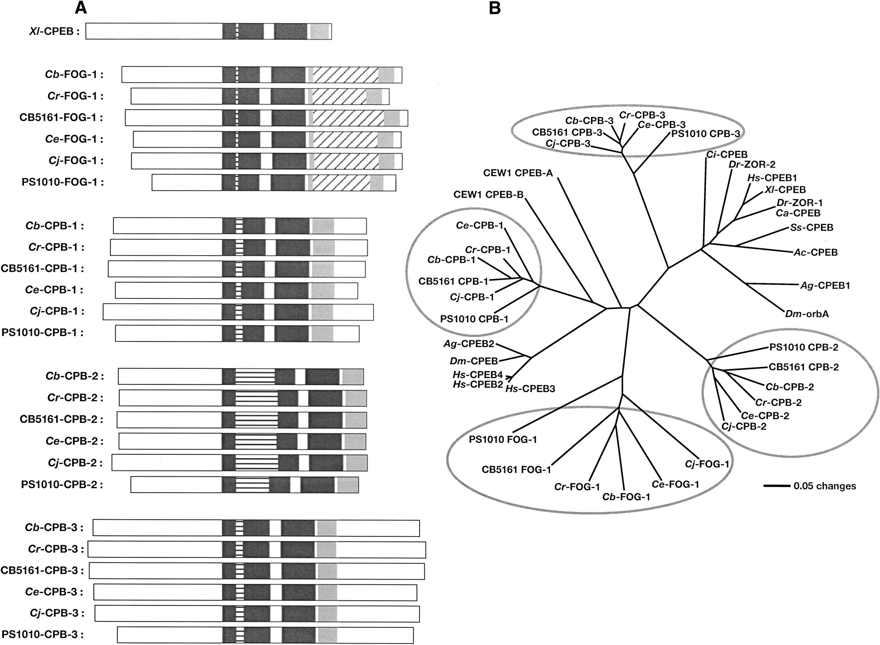 Each Caenorhabditis species has four CPEB genes. (A) CPEB domain structures. Each protein is depicted as a white box, with the amino terminus at the left. The RNA recognition motifs (RRMs) are dark gray and the C-H domain is light gray. Insertions within the first RRM are horizontally striped, and insertions within the C-H domain are diagonally striped. (Xl) Xenopus laevis; (Cb) Caenorhabditis briggsae; (Cr) C. remanei; (CB5161) C. sp. CB5161; (Ce) C. elegans; (Cj) C. japonica; (PS1010) C. sp. PS1010. (B) Neighbor-joining tree showing the relationships among CPEB genes. This tree is based on an alignment of sequences from the conserved RRM1, RRM2, and C-H domains. Each nematode gene family is circled in gray. Nematodes are listed in A, but also include Oscheius tipulae (CEW1). Other animals are as follows: (Dm) Drosophila melanogaster; (Ag) Anopheles gambiae (malaria mosquito); (Ss) Spisula solidissima (Atlantic surf clam); (Ac) Aplysia californica (California sea hare); (Ci) Ciona intestinalis (ascidian tadpole); (Dr) Danio rerio (zebra fish); (Ca) Carassius auratus (gold fish); (Hs) Homo sapiens.